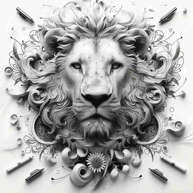 This AI-generated tattoo project presents a monochrome lion head concept framed by floral motifs and ornamental ribbons. Executed in a fine line, black and grey palette, the piece relies on precise line work, negative space, and subtle shading to carve the lion’s mane and facial expression with lifelike depth while maintaining a decorative edge. The central lion embodies strength and vigilance, a timeless motif enriched by surrounding flowers that symbolize growth and renewal; the ribbons and scrollwork weave in a sense of movement and balance, echoing traditional tattoo design trends while staying contemporary. The composition reads as a dense, highly detailed surface that works well on larger canvases yet remains readable when scaled down, thanks to careful line weights and contrast. The high-contrast blacks establish a bold silhouette for easy readability against varied skin tones, while the grey washes provide three-dimensionality and texture, yielding a realistic tattoo feel within the black and grey spectrum. Because this is an AI-generated tattoo project, the concept demonstrates how algorithmic exploration can inspire cohesive body art while preserving artistic control in the final custom tattoo design. The layout is deliberately pattern-rich, aligning with the cover-up objective: the dense line work and dark shading can effectively obscure older ink, transforming a busy area into a refined, unified piece. For meaning, the lion communicates courage and leadership, paired with floral accents to suggest vitality and metamorphosis—an ideal candidate for a meaningful tattoos portfolio, small tattoos or larger back/chest placements. While rooted in a classic motif, the design borrows lightly from Japanese style tattoo composition to achieve a balanced composition that remains versatile for a modern audience, ensuring it can be adopted to various sizes and skin tones. Overall, this concept showcases the best practices of tattoo design: precise fine lines, clean black and grey contrast, and durable reading on skin, with attributes that appeal to collectors seeking unique custom tattoo design, floral elements, and a striking, timeless image in ink.