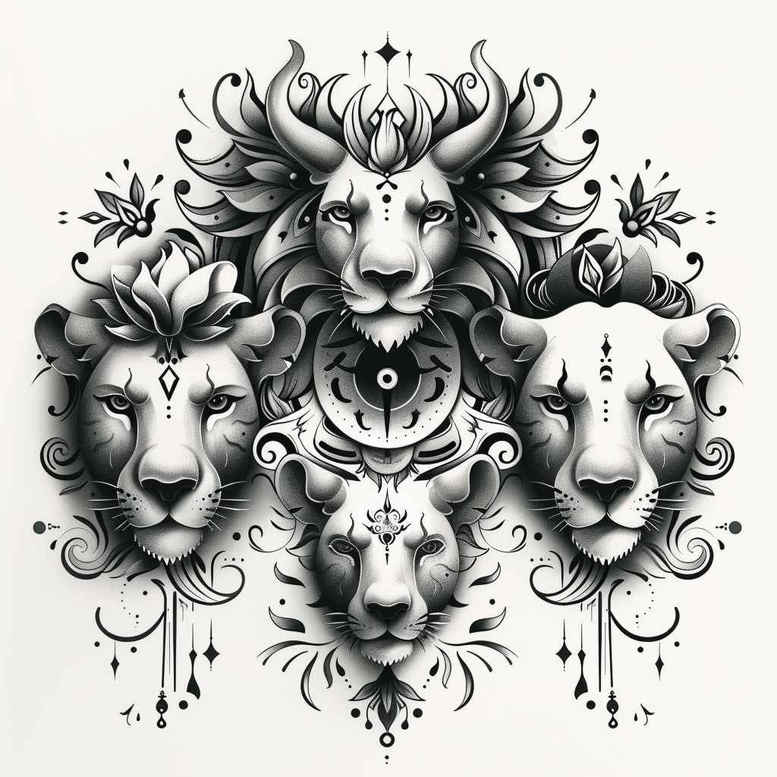 This AI-generated tattoo project presents a black and grey composite of five lion heads arranged in a symmetric mandala-like formation, the central head anchoring the composition while the surrounding heads radiate outward. Ornamental florals, vines, and teardrop motifs weave between the figures, creating a dense yet readable pattern that works well on larger canvases such as back, sleeve, or chest, while retaining clarity at smaller scales through deliberate negative space and contrast management. The linework alternates crisp fine lines with smooth grayscale shading to render fur texture, facial features, and mane density with a sense of realism grounded in traditional black and grey tattooing, yet driven by contemporary ornamental design. This piece nods to Japanese and tribal tattoo sensibilities through its balanced geometry and repeating motifs, while staying accessible as a modern, custom tattoo design that can be adapted to various stylistic directions. The symbolism is multifaceted: lions evoke courage, leadership, guardianship, and protection; the floral elements symbolize growth, renewal, and resilience; together they form a meaningful tattoo design suitable for meaningful tattoos enthusiasts seeking a bold statement that remains elegant in black and grey. As a small-batch, custom tattoo design, it invites tailoring of scale, line weight, and shading to fit individual anatomy and skin tone, and its dense dark areas make it particularly suitable as a cover-up tattoo for concealing old ink or scars; it remains versatile for various placements and styles, including lotus flower tattoo or flower tattoos motifs within a larger Japanese or ornamental sleeve. The design also serves as a versatile cover-up concept for clients seeking to replace darker ink with a refined, harmonious motif that preserves meaning while offering a fresh aesthetic.