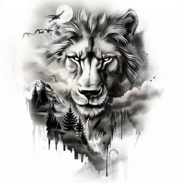 This is an AI-generated tattoo project concept featuring a highly detailed wolf head emerging from a forest of pine trees, rendered in black and grey with soft watercolor washes and dripping ink effects. The composition centers on the wolf’s piercing gaze, snout, and mane, while the lower forest forms anchor the image and blend into mist and clouds, creating a seamless vertical piece. The grayscale shading uses deep blacks and mid-tones to convey volume, with fine linework for fur texture and bold silhouettes for the pines. The watercolor-like bleeds give a sense of movement, as if the scene bleeds into the skin. The design has potential as a wrap-around on the arm or shoulder, and its dark tonality makes it an excellent candidate for a cover-up; the heavy shadows can obscure existing tattoos beneath while preserving detail in key focal points. In terms of symbolism, the wolf evokes guardianship, instinct, and loyalty, while the pine forest anchors the creature in nature and resilience; the moon-like glow and mist imply mystery and transformation. For tattoo enthusiasts, this concept fits within black and grey realism, with room to adapt toward a Japanese-style or tribal hybrid, or to rework as a fine-line or botanical composition. This tattoo design emphasizes bold negative space, texture, and contrast—qualities that translate well into both small tattoos and larger body art pieces, and it aligns with search terms such as tattoo, tattoo design, meaningful tattoos, fine line tattoo, black and grey, realistic tattoo, and ink. As an AI-generated tattoo project concept, it is presented here as a starting point for a cover-up-friendly conversion, with room to adjust line weight, shading, and scale to suit client needs.