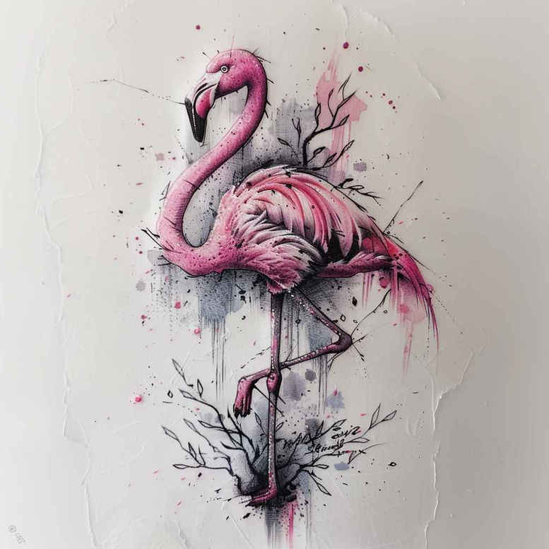 This AI-generated tattoo project presents a flamingo rendered in a luminous watercolor style, with soft pink plumage blending into cool blue reflections and subtle black linework. The composition places the bird in profile, standing on one leg, framed by a delicate wash of water droplets and splashes that suggest movement and atmosphere. Painterly edges bleed into the surrounding space, giving the design a contemporary, artistic feel that translates well to skin while preserving readability at small sizes. Fine line outlines define the flamingo’s graceful neck and slender legs, while broad color washes provide volume and life without turning the piece into a crowded scene. A few branch-like elements and a suggestion of water create depth and anchor the figure, offering a natural backdrop that can support a cover-up when darker ink is incorporated into the background. The chosen palette centers on pinks and corals with cool blues and gray shadows, allowing technicians to adjust saturation to suit skin tone and individual preference, and making the concept adaptable from a small tattoo to a larger, statement piece. From a symbolic standpoint, the flamingo evokes balance, elegance, and resilience; pairing it with water and branches reinforces themes of growth, patience, and nature’s quiet strength. This tattoo design aligns with trends in watercolor and fine line techniques, while promising a timeless look for flower tattoos and other nature motifs; it can be reimagined as a lotus flower tattoo or a more realistic black-and-gray rendition if desired, and remains highly suitable for a meaningful tattoo design for personal or commemorative purposes. Because this is an AI-generated tattoo project, it serves as a flexible starting point for a custom tattoo design, enabling artists to explore color fidelity, line density, and background treatment while keeping the flamingo as the focal point.