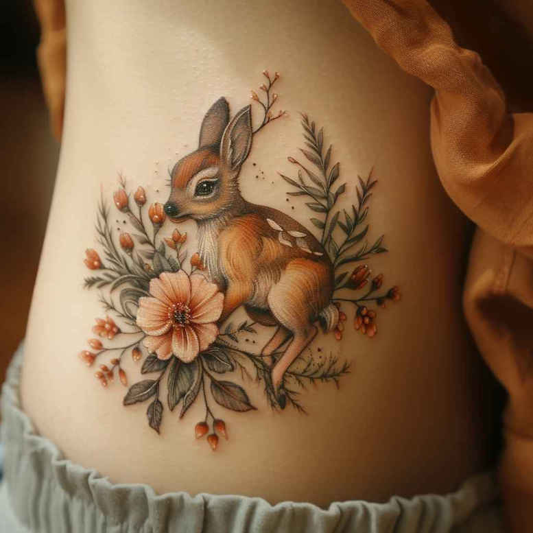 AI-generated tattoo project concept depicting a gentle rabbit resting among a bouquet of blossoms and foliage on the skin. Rendered in color with soft gradients and fine line edges, the piece reads as a delicate, painterly study that leans toward a timeless, romantic vibe. The central figure is a young rabbit, shown in a natural pose with subtle shading that captures fur texture and a curious, earnest gaze. Surrounding the animal, a bouquet of blossoms—peach petals, blush pink blooms, and pale blue accents—combines with slender branches and sprigs of greenery to frame the scene and guide the eye toward the creature. The palette stays warm and earthy, enabling the design to age gracefully and resist fading, while the soft transitions between hues give the tattoo a gentle, almost textile softness. Technique wise, the work resembles a watercolor tattoo with light washes and restrained contrast, producing a soothing contrast against the skin rather than high-contrast graphic style. In terms of symbolism, the rabbit evokes gentleness, innocence, and renewal, while the floral elements speak to growth, beauty, and nature’s cycles; together they form a meaningful tattoo design for anyone seeking a small, intimate image. Although presented as a complete concept, the tattoo would adapt well to various sizes and placements—ankle, wrist, or shoulder—by adjusting line weight or color saturation. This is an AI-generated tattoo project, illustrating how a narrative floral scene can translate into real body art. For tagging and discovery, the piece centers on a rabbit and floral motifs in full color, with emphasis on a painterly, romantic aesthetic; relevant keywords include tattoo design, meaningful tattoos, fine line tattoo, lotus flower tattoo, infinity tattoo, tribal tattoo, rose tattoo design, small tattoos, flower tattoos, custom tattoo design, Japanese style tattoo, black and grey, realistic tattoo, body art, ink.