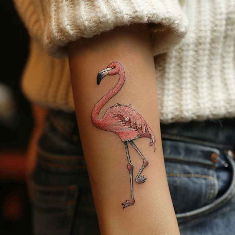 This tattoo study presents a pink flamingo rendered in a delicate watercolor-inspired palette with fine line outlining, positioned along the forearm. The composition relies on slender, clean lines to define the bird’s elegant neck, head, and curved body, while soft washes of pink provide the primary color, complemented by subtle gray and black shading to suggest texture and depth. The flamingo stands on a single leg, a classic pose that evokes balance and grace, with the leg and beak lightly accented to convey realism without heavy ink saturation. Surrounding elements are intentionally minimal: there is a visible forearm, a portion of a beige sweater cuff near the elbow, and denim jeans below, offering a casual, modern context that makes this tattoo feel approachable in everyday life. The design emphasizes negative space to preserve skin tone and keep the piece light, ideal for someone seeking a refined, understated statement. From a technical standpoint, the artist employed fine-line techniques to achieve crisp outlines and controlled ink density, balanced by watercolor-style color application to produce a soft gradient and gentle transitions. The result reads as a small to mid-size tattoo with a clean silhouette, suitable for a first tattoo or a meaningful addition to a sleeve. In terms of meaning, flamingos often symbolize balance, grace, and the ability to adapt, while pink hues convey warmth, compassion, and tenderness. This piece would pair well with Japanese-style motifs or floral accents for a more elaborate custom tattoo design, or stand alone as a meaningful tattoo design for someone seeking a personal symbol. Though the image is rendered with color and delicate shading, it remains versatile for a range of skin tones and placement considerations. It is presented here as an AI-generated tattoo project concept, illustrating how fine-line and watercolor techniques can be combined to create an elegant tattoo design. The piece emphasizes that color-blocked or realistic styles can still be faithful to a minimalistic concept, and it demonstrates how a small, precise pink flamingo tattoo can read clearly from a distance, ensuring legibility and longevity while preserving the wearer’s natural skin texture. If you are exploring small tattoos, this design offers a refined option that remains adaptable to a variety of body art contexts, from casual daily wear to more formal settings.