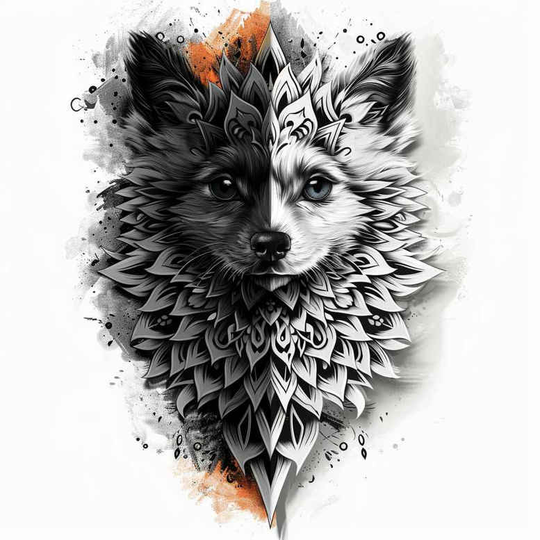 This AI-generated tattoo project presents a striking split portrait of a wolf, merging realism-inspired shading with a bold geometric pattern. The left half of the head is rendered in dense black shading, while the right half relies on crisp linework and negative space to create a luminous contrast. The geometric tessellations form a sculptural mane that radiates outward, giving the design a modern tattoo design aesthetic that works as a compelling cover-up concept. Orange ink splashes provide a dynamic accent, energizing the grayscale palette without overpowering it. The piece reads as both a fierce animal portrait and a contemporary pattern study, suitable for forearm, shoulder, or calf placements, depending on scale. The split motif invites narratives of duality, loyalty, and resilience—concepts that resonate in many meaningful tattoos—and the black and grey palette ensures compatibility with skin tones and imperfections, which is why it is ideal for a cover-up. Technically, the design relies on fine line geometry, controlled line weight, stippling for texture, and smooth gradient shading to achieve depth on skin. This tattoo design nods to Japanese style through balanced symmetry and clean line articulation, while remaining accessible to a wide range of custom tattoo designs. For those seeking a bold yet refined piece, the combination of geometric pattern and animal realism offers strong visual impact and lasting symbolism; the wolf stands for guardianship and strength, while the geometric facets emphasize precision and modern artistry. Because the composition leans heavily on black and grey shading, it remains forgiving for cover-ups and adapts well to newer imagery placed over older tattoos. As an AI-generated tattoo project, it serves as a high-concept reference for artists and clients alike, illustrating how tonal balance, pattern work, and composition interact in body art. Keywords: tattoo, tattoo design, meaningful tattoos, fine line tattoo, wolf tattoo design, black and grey, realistic tattoo, ink.