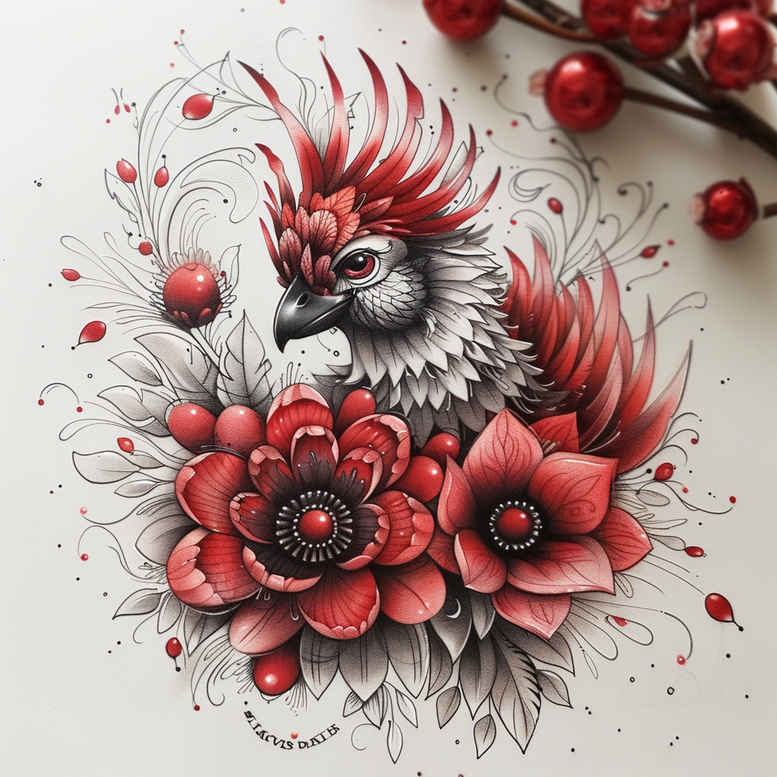 This AI-generated tattoo concept combines a poised phoenix with a cluster of red roses, rendered in fine line technique with black and grey shading and selective color. The phoenix features delicate feather detail and subtle gradations, while the roses and petals are saturated with bold red accents to create a striking focal point. The composition employs clean outlines, stippling, and carefully managed negative space to maintain legibility on skin, whether placed on the forearm, upper arm, or back. The tonal balance between the monochrome plumage and vivid blossoms yields a versatile tattoo design that can be executed as a black and grey piece with red highlights or translated into a full-color rendition. Symbolically, the phoenix represents rebirth, resilience, and transformation, and the roses symbolize love, passion, and memory; together they tell a meaningful tattoo narrative about renewal. The technique emphasizes precision in fine line work, crisp line weight, and controlled shading to ensure long-term readability. This concept fits within the broader spectrum of flower tattoos and adds mythic symbolism to a timeless design, appealing to those seeking small tattoos or larger body art projects. It also sits comfortably within Japanese style tattoo influences if placed with appropriate flow, while maintaining the clarity of a modern realistic tattoo aesthetic. As an AI-generated concept, it demonstrates how botanical and mythical motifs can be merged into a customizable tattoo design that adapts to different body contours and skin tones. For clients exploring ink with narrative depth, this phoenix-and-rose composition provides a versatile template that can be scaled up for a sleeve or chest piece or refined for a discreet mini-tattoo.