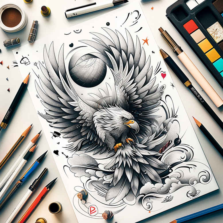 This black and grey study presents a powerful bird with wings fully spread, its body anchored by a circular sun orb that sits behind the head. Rendered in fine line technique with careful feather stippling and smooth gradients, the piece relies on bold silhouettes for clarity while maintaining soft transitions in midtones so it reads well at tattoo size. The composition places the bird as the central motif, using the sun as a counterbalance that also implies cyclic renewal, a common thread in meaningful tattoos. The design is deliberately dense in value, which makes it an excellent candidate for a cover-up on older marks, as heavy blacks and layered shading offer strong concealment while preserving subtle detail. The linework emphasizes texture: the plumage is built from parallel hatch marks, cross-contours, and delicate feather barbs, while the sun orb is treated with a gentle halo to prevent visual noise. As an AI-generated tattoo project, this concept demonstrates how digital drafting can inform traditional tattoo practice, providing a flexible template that can be scaled to forearm, chest, or back placements. In real skin, it can be refined with adjustments to line weight, contrast, and integration with floral or script elements to convey personal meaning. Stylistically, the piece aligns with black and grey realism and fine line technique, drawing on influences from Japanese style tattoo and tribal linework for structure, while staying faithful to a modern, clean silhouette. Potential motifs to enhance the message include lotus flower tattoo symbolism for rebirth, infinity tattoo ribbons for continuity, or small floral accents to soften the composition, making it adaptable as a custom tattoo design for a range of body art goals. Overall, the design prioritizes legibility, longevity, and impact, ensuring it remains clear and striking as a standalone piece or as part of a larger sleeve idea; the cover-up potential is a central advantage for clients seeking to disguise prior ink while achieving a bold, meaningful tattoo with timeless appeal.