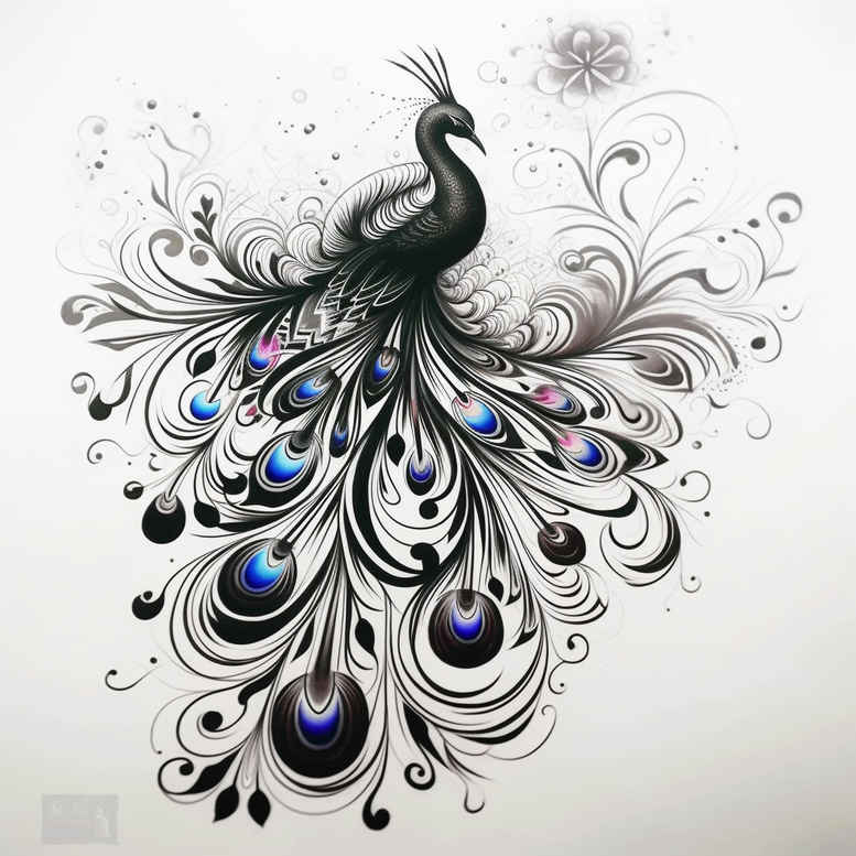 This AI-generated tattoo project imagines a peacock-inspired motif rendered in precise black and grey linework with selective blue and purple accents. The central figure is a stylized peacock whose tail unfurls into a sweeping fan of feathers, each plume formed by elegant lines and micro-shading that read clearly at small scales. The tail features repeated eye motifs and lace-like swirls, creating a deliberate pattern that balances dynamism with order. Jewel-toned hints of blue and purple provide subtle contrast against the monochrome base, helping the design pop on skin without overwhelming it. The approach emphasizes fine line tattoo aesthetics: clean contour lines, restrained shading, and careful negative space to preserve legibility on curved surfaces. This concept is designed with versatility in mind, suited for placement on the shoulder, back, or chest, and scalable for forearms or calves while maintaining its intricate balance. Symbolically, the peacock conveys beauty, resilience, and renewal, with the expansive tail suggesting abundance and graceful movement. From a technical perspective, the piece can be executed with black ink shading or adapted to all-grey gradients, depending on client preference; the ornamental swirls and patterning can either be simplified for a minimal take or expanded for a dramatic sleeve. As an AI-generated concept, it serves as a starting point for collaboration with a tattoo artist, who can tailor line density, feather spacing, and color saturation to suit skin tone and body contour. If a more timeless glyph is desired, the pattern can be tightened for a smaller tattoo or opened up for a bold, statement piece. The motif’s patterning also makes it a strong candidate for cover-up transformations in darker inks. The description integrates keywords for discoverability—tattoo, tattoo design, meaningful tattoos, fine line tattoo, lotus flower tattoo, infinity tattoo, tribal tattoo, rose tattoo design, small tattoos, flower tattoos, custom tattoo design, Japanese style tattoo, black and grey, realistic tattoo, body art, ink—while presenting a distinct, artful approach to contemporary body art.