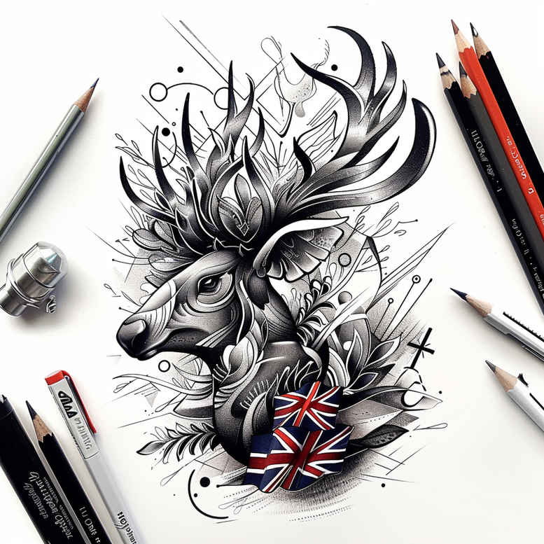 AI-generated tattoo project concept: a moose head in black and grey linework with a Union Jack flag across the chest, a bold, expressive cover-up-ready motif. The piece uses fine-line tattoo technique: crisp outlines, restrained shading, cross-hatching, and negative space to preserve clarity on skin. The moose head is rendered in profile, with antlers branching into a spray of jagged lines that echo the flag’s geometric angles. The Union Jack flag is integrated into the chest area as a graphic, abstracted rather than a literal patch; the flag’s colors are suggested through color cues within the linework and shading, while the overall palette remains predominantly black and grey to ensure longevity. The design is meant to function as a meaningful tattoo that can be read from a distance and up close, balancing symbolism of strength, heritage, and travel. The concept suits larger placements like the chest, shoulder, or upper arm, while remaining adaptable for smaller forms through scaling and line density adjustments. The inclusion of the flag pattern adds a recognizable motif without overpowering the animal’s silhouette, producing a cohesive piece suitable for someone seeking a strong cover-up after an earlier tattoo. The artwork is deliberately dark in tone, with deep blacks and layered shading creating depth and contrast; this reinforces its suitability as a cover-up option, allowing practitioners to mask underlying ink while preserving iconic shape. This project aligns with the broader tattoo design landscape, including meaningful tattoos, custom tattoo design, and black and grey realism, while nodding to Japanese style tattoo through controlled line discipline. For SEO and inspiration, keywords such as tattoo, tattoo design, fine line tattoo, small tattoos, flower tattoos, lotus flower tattoo, infinity tattoo, tribal tattoo, rose tattoo design, and realistic tattoo echo in the narrative to help with discoverability. Although the current render is AI-generated, it serves as a practical concept for an ink-ready tattoo project, ready for adaptation by professional studios. In sum, this moose head with Union Jack emblem represents a bold, cover-up-friendly statement piece that merges natural form with iconic symbolism in a way that ages gracefully and communicates personal meaning through design.