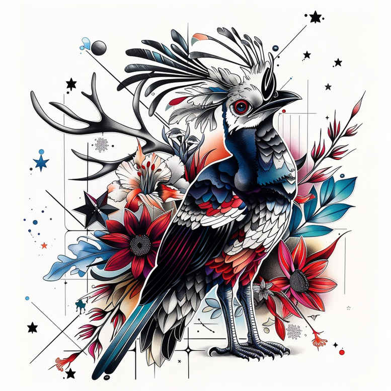 This AI-generated tattoo project presents a vibrant, color-forward composition that intertwines a stylized bird with an array of blossoms, executed in watercolor-like washes and precise line work. The central motif is a bird with a long, sweeping tail, rendered in bold black ink with white highlights and accented by red and blue flowers that radiate outward in a dynamic floral pattern. Leaves and stems weave through the arrangement, adding movement and balance. The design reads as both a tribute to nature and a study in contrast: crisp outlines ground the piece while painterly color washes impart depth and atmosphere, evoking Japanese style tattoo influences and contemporary fine line aesthetics. Although the piece leans toward full color, careful shading and contrast ensure legibility on skin, making it adaptable to placements from forearm to shoulder, and structured enough to function as a cover-up candidate if needed, thanks to its dense silhouette and floral density. The concept embraces meaningful tattoos: the bird can symbolize resilience, renewal, and freedom, while the blossoms signify growth, beauty, and the cycles of life. This project also demonstrates how AI-driven ideation can yield cohesive, market-ready designs suitable for custom tattoo design, small tattoos or larger body art statements, and can be tailored to individual symbolism, color preferences, and line style. References to lotus flower tattoo, rose tattoo design, and floral motifs are embedded to broaden search relevance, while keeping a unified color narrative of blues, reds, and black ink. In essence, the piece embodies a contemporary fusion of botanical illustration and tattoo-ready composition, offering ink-ready potential for clients seeking vibrant, pattern-rich artwork that reads clearly at various sizes and ages gracefully on the skin.