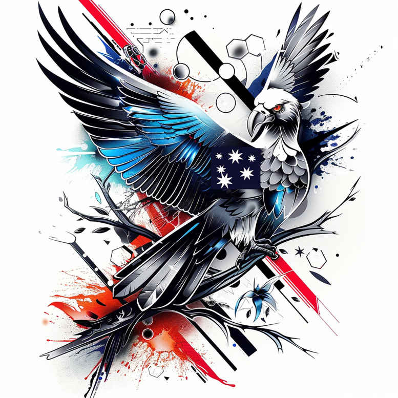 An AI-generated tattoo project that presents a dynamic neo-traditional eagle motif framed by flag-inspired elements and splashy color. The composition centers on a bold eagle in flight with its wings spread, accompanied by a secondary bird that adds motion and depth; behind them, red and blue stripes weave through a splattered backdrop, all rendered with crisp black outlines to preserve legibility on skin. The palette is full color, but the line work remains adaptable to black and grey if a client desires a subtler take; this versatility makes it a strong candidate for custom tattoo design. The concept blends classic symbolism—the eagle representing courage and freedom—with patriotic undertones from the flag motif, inviting personal readings such as heritage, resilience, or achievement. The style nods to neo-traditional tattoo aesthetics: heavy contour lines, vivid color, and a balanced mix of solid areas and negative space, while the splatter and brush-stroke feel evoke a contemporary ink technique that can be scaled up for back pieces or tightened into a fine line tattoo variant for smaller areas. For a tattoo design professional, the work offers opportunities to experiment with different motifs: the same eagle-and-flag core could be paired with lotus flower tattoo elements for harmony, infinity tattoo motifs to imply endless motion, or tribal tattoo line work to emphasize rhythm and abstraction; there is room to graft Japanese style tattoo shading, and to translate the concept into realistic tattoo textures if a client desires lifelike feather detail. Given its bold silhouette and high-contrast color, the piece transfers well across mediums and skin tones, and it stands as a meaningful tattoo design choice for those seeking a strong, attention-grabbing statement piece, or for a thoughtful starting point in a broader sleeve project. Additionally, this concept aligns with current trends in custom tattoo design that value storytelling, symbolism, and technical craftsmanship, while remaining flexible for iterations that reduce or increase complexity. As an AI-generated tattoo project, it invites collaboration with a tattoo artist to calibrate proportions, ink saturation, and shading gradients to the wearer’s anatomy, ensuring enduring color fidelity and a timeless silhouette. In summary, the eagle-and-flag design blends energy, patriotism, and artistry into a versatile canvas that can evolve from a small, bold tattoo to a comprehensive back piece, anchored in ink expertise and personal meaning.
