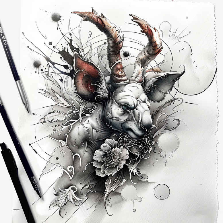 AI-generated tattoo project exploring a ram head motif integrated with a floral bouquet in black and grey. The concept blends high-detail line work with soft shading to create depth and texture. The central element is a ram’s head with curling horns, rendered in grayscale to convey strength and vigilance. Surrounding the head, a cascade of roses and leaves expands the composition into an ornamental bouquet, offering contrast between hard bone and delicate petals. Fine line strokes define the floral forms, while smooth gradient shading builds volume on the ram’s muzzle, horns, and facial features. The visible pencils and brushes hint at the iterative design process, underscoring that this is a tattoo concept born from AI-generated ideation. The piece reads as a versatile cover-up option: the dense dark tones provide ample opportunity to mask a previous tattoo, while the floral elements can be positioned to guide the transition across existing ink. The overall tone is monochrome to maximize longevity and fidelity on skin, balancing solid black ink with subtle grey washes. The ram symbol evokes resilience and determination, the flowers suggest renewal and growth; together they deliver a meaningful tattoo narrative suitable for a private collection or a larger back piece. For those seeking a medium-scale tattoo, this design can emphasize the ram as the focal point with trailing florals, or be extended into a sleeve. It sits comfortably within black and grey realism and botanical-inspired body art, offering a custom tattoo design that remains legible with aging. In sum, the concept fuses animal symbolism with floral ornament, leveraging grayscale contrast to achieve dramatic impact while remaining adaptable for cover-up and style. The piece is adaptable to placement from forearm to back, and can be reworked to emphasize negative space. This approach aligns with tattoo trends in black and grey realism, fine-line technique, and botanical ink, appealing to collectors of meaningful tattoos and those seeking a strong custom tattoo design.