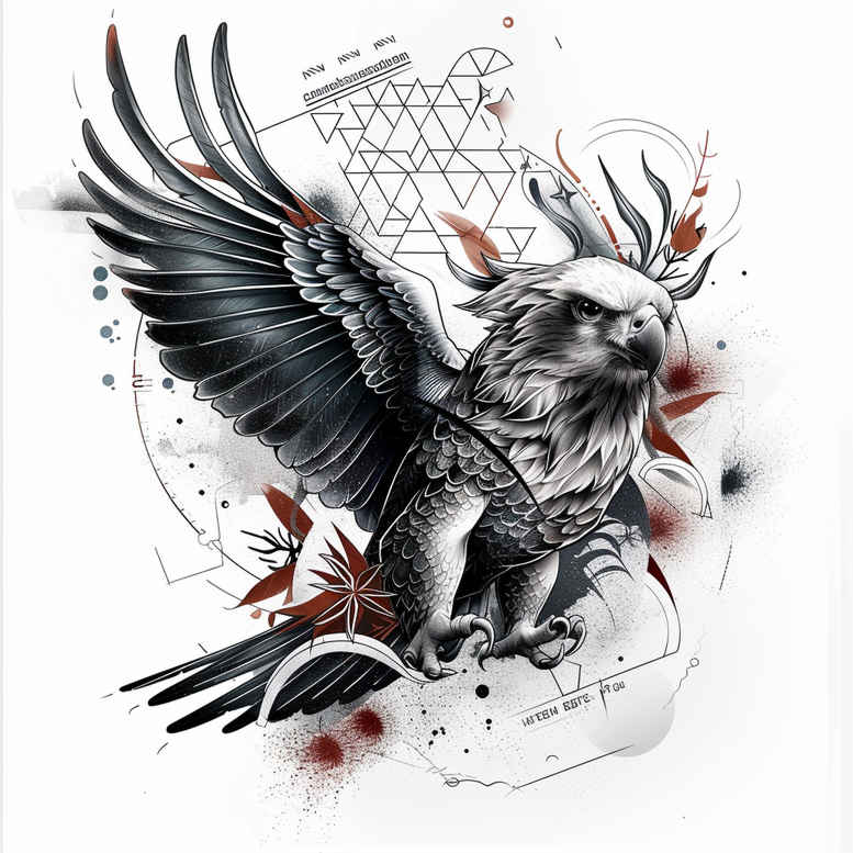 This piece presents a striking griffin-inspired tattoo study rendered in black and grey with meticulous linework and subtle shading. The central figure blends the majesty of an eagle-like body with the intrigue of antlers, creating a mythic hybrid that reads as both protector and wanderer. The wings are captured in dynamic motion, each feather defined by fine lines and smooth grayscale transitions that give a sense of depth without relying on heavy saturation. Behind the creature, a geometric backdrop of triangles and tessellations adds a modern, almost architectural counterpoint to the organic silhouette, reinforcing a pattern-driven aesthetic that will appeal to fans of geometric tattoo design. Small splashes of red ink punctuate the composition, acting as focal anchors while preserving the overall monochrome mood; these splatters also emphasize the tattoo’s bold contrast. The design sits squarely in the realm of black and grey realism, with careful attention to texture—feather softness, nacreous eye detail, and the rough texture of antler surfaces. The linework shows fluent control across variable needle sizes, with lighter stippling in the shadows to create a velvety gradient and a sense of three-dimensional form. The griffin’s head is rendered with a piercing gaze and subtle beading around the eye, while the body’s plumage exhibits a naturalistic feather pattern that transitions to smoother shading along the underbelly. The geometric background is not merely decorative; it acts as a precise guide for placement on the skin, helping to align the wings with the wearer’s shoulder and upper arm curves, while the triangles’ angles draw the eye toward the creature’s center. As a tattoo concept, it offers a strong narrative: a guardian figure formed from disparate natural elements, suggesting themes of protection, transformation, and the balance between wild nature and structured design. For those seeking a cover-up project, the strong dark values and dense shading provide ample opportunity to integrate or mask existing ink beneath a new, cohesive image, and the geometry helps align lines with the body’s contours. This piece is an AI-generated tattoo project, intended as a bold, meaningful tattoo design that works well as a standalone statement or as part of a larger sleeve. The combination of griffin symbolism, black and grey realism, and geometric accents makes it suitable for those exploring small tattoos or larger body art explorations, while the precise linework supports a high-quality, long-lasting ink with timeless appeal. In short, it stands as a credible, ready-to-tattoo concept for clients seeking a cover-up with depth, atmosphere, and a touch of myth. The design translates well to a range of skin tones and body placements, with potential for color accents if the client desires.