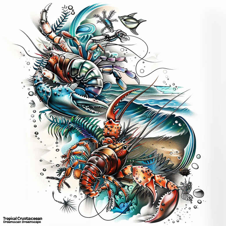 AI-generated tattoo project presents a vivid marine scene rendered in full color, combining dynamic linework with painterly washes. The centerpiece features two lobsters, rendered in orange and cobalt, twisting around curling ocean waves that surge with turquoise highlights and deep blue shadows. Seaweed ribbons weave through the composition, while bubbles and splashes add motion and texture, giving the design a lively, painting-like quality. The piece emphasizes contrast between bright warm tones of the crustaceans and cool tones of the sea, achieved through precise black outlines, layered color fills, and subtle gradient shading. The artwork blends illustrative flair with a touch of neo-traditional influence, echoing a disciplined line weight and crisp contouring while remaining adaptable to typical tattoo canvases. The subject matter invites a narrative: resilience and tenacity embodied by the lobster, and the ever-changing flow of life represented by waves; together they form a compact symbol set suitable for meaningful tattoos about growth, journey, and renewal. The composition also functions well as a larger centerpiece on the back, chest, or upper arm, with scalable detail that keeps fine-line elements—antennae, water droplets, foam—recognizable at smaller sizes or in high-resolution color. For fans of graphic motion, the pattern-like rhythm of the water swirls and the alternating orange and teal hues create a strong visual cadence that translates across ink formats, from small tattoos to full-color sleeves. As a modern ink concept, this tattoo design aligns with trends in color realism and illustrative work, while offering customization opportunities such as tweaking the color balance, line density, or adding additional sea life or floral accents. Note that this is an AI-generated tattoo project concept; its bold color-forward approach encourages an experienced artist to explore placement and adaptation for personal meaning and body artistry. Keywords to consider include tattoo, tattoo design, meaningful tattoos, fine line tattoo, lotus flower tattoo, infinity tattoo, tribal tattoo, rose tattoo design, small tattoos, flower tattoos, custom tattoo design, Japanese style tattoo, black and grey, realistic tattoo, body art, ink.