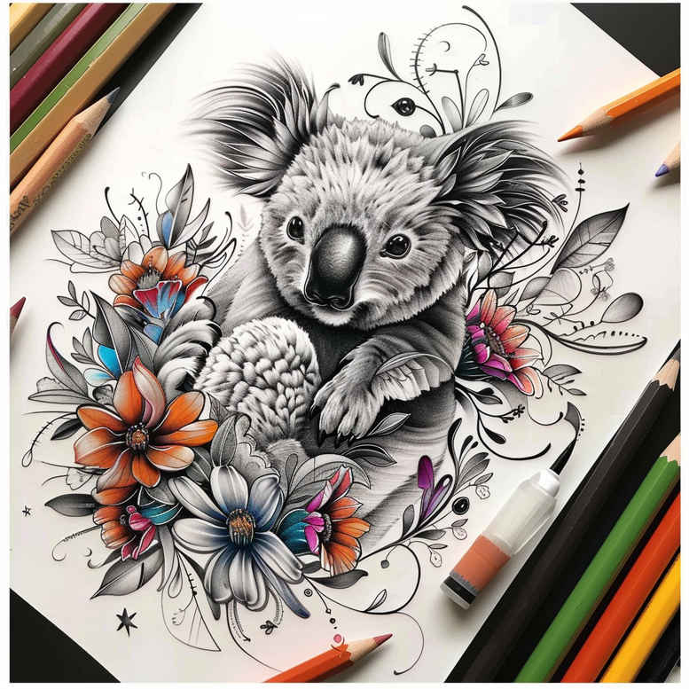 AI-generated tattoo project concept: this design pairs a lifelike koala portrait in black and grey with an exuberant field of florals rendered in color, creating a striking balance between realism and botanical flourish. Executed in fine line technique, the koala is built from delicate linework and subtle shading to convey soft fur texture, while the surrounding blossoms—including daisies and poppy-like blooms—are colored to draw the eye and add contrast. The composition leans into floral pattern sensibilities, with stems and petals weaving around the animal to suggest movement and a natural frame for placement on the forearm, upper arm, or calf. The floral accents use a selective color palette: warm oranges, cool blues, pinks and purples that pop against the monochrome koala. The background is kept minimal to maintain readability and avoid overwhelming the main subject, a strategy commonly used in modern black and grey with color highlights tattoos. The piece nods to Japanese and botanical traditions, translating koi-like shading into a soft, adorable koala persona while borrowing the restraint of fine line tattoo for the animal and the floral detailing for visual rhythm. In terms of meaning, the koala evokes calm, gentle strength and a connection to nature, while the flowers symbolize growth and renewal; together they form a meaningful tattoo design for someone seeking a gentle but expressive piece. This concept is suitable for small tattoo areas or larger panels, and would translate well into a custom tattoo design with line precision and careful color work. As an AI-generated tattoo project concept, it demonstrates how linework and color highlights can co-exist, delivering a cohesive body art piece with potential for layering in Japanese style influences, black and grey shading, and floral motifs. If you’re exploring a tattoo design that blends realism with botanical artistry, this koala-flower concept offers a versatile blueprint for a refined, modern look.