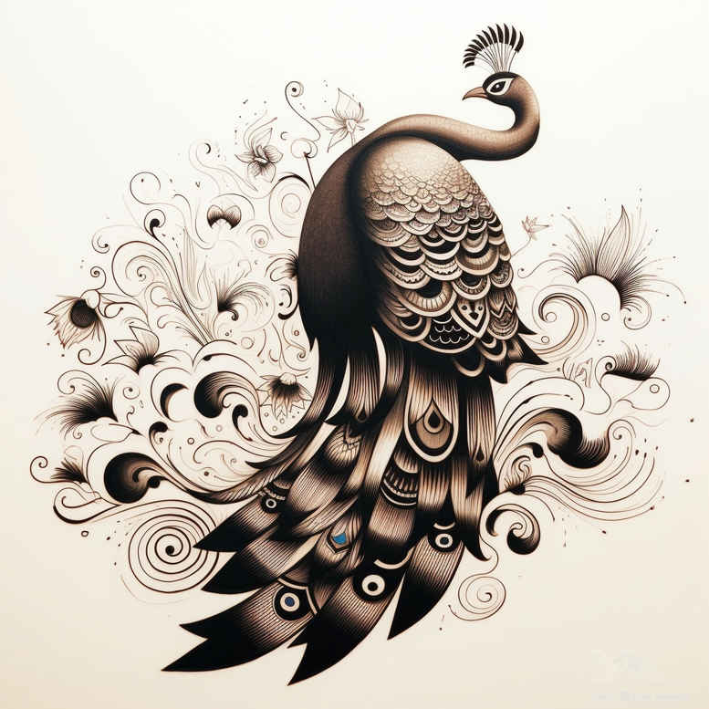This tattoo design centers on a regal peacock, its silhouette carved in black and grey with an expansive tail composed of ornate, flowing swirls. The plumes display eye-like motifs and geometric flourishes that form a continuous pattern across the tail, creating a pattern-led composition that rewards close inspection. The technique emphasizes fine line precision and restrained shading to achieve depth while preserving a crisp, painterly feel characteristic of ornamental styles. The peacock’s form harmonizes with ribbons and floral-inspired motifs, hinting at Japanese style tattoo influences while retaining a modern, realistic vibe suitable for body art enthusiasts. As a stand-alone piece, it works well on the upper back, shoulder blade, or thigh, but it can also be scaled down for small tattoos or expanded into a larger sleeve or back piece. Symbolically, the peacock represents renewal, beauty, and immortality, lending meaning to meaningful tattoos for clients seeking personal resonance; the swirls and patterning echo tribal and lotus- or flower-themed motifs, allowing for adaptable line weight and shading. The black and grey palette ensures strong contrast on a range of skin tones and ages gracefully, while negative space around the swirls helps the ink breathe. Note that these are AI-generated tattoo projects used to explore form, balance, and line weight; professional artists can tailor this concept to individual anatomy and preferences. Keywords woven through include tattoo, tattoo design, meaningful tattoos, fine line tattoo, lotus flower tattoo, infinity tattoo, tribal tattoo, rose tattoo design, small tattoos, flower tattoos, custom tattoo design, Japanese style tattoo, black and grey, realistic tattoo, body art, ink. With careful adjustment, the tail feathers can be presented with additional negative space to lighten the overall composition, or the plume can be condensed to a single vertical motif for a minimalist statement. The concept supports both bold detailing and subtle shading, enabling tattoo artists to adapt to chest, back, or leg placements. The design’s rhythm guides the eye along the plume’s arc, creating a sense of movement and life. When scaled up, the intricate line work becomes a showcase of craftsmanship; when reduced, the essential silhouette remains legible and striking. This exploration illustrates how a single subject can yield multiple aesthetic outcomes through pattern, weight, and spacing, making it a flexible option for clients seeking a personal narrative in ink.
