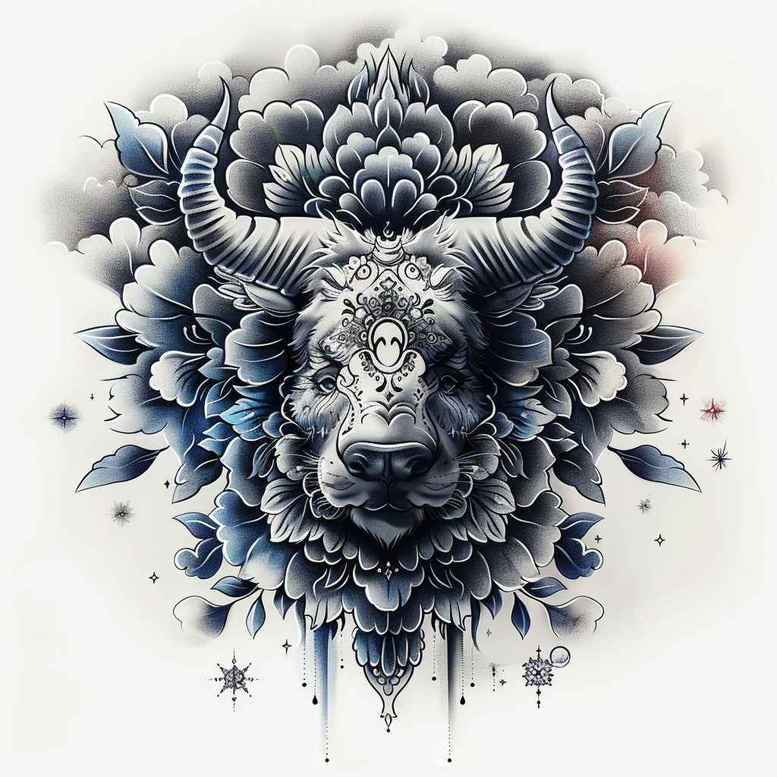 An evocative ram head tattoo design framed by an elaborate floral mandala, rendered in blue accents with black-grey shading. The central bovine head anchors a symphony of layered petals, geometric mandala elements, and delicate filigree that radiate outward with crisp symmetry. The technique leans into fine line tattoo tradition: precise, ultra-thin strokes define the ram’s fur texture, horn contours, and the piercing gaze, while soft gradations of blue and grey create depth without heavy saturation. The floral components echo lotus blossoms and garden blooms, weaving into a mandala scaffold that balances naturalism with ornamental geometry. This combination yields a piece that reads as both a realistic study of form and a symbolic tapestry of meaning: the ram stands for determination, courage, and leadership, while the surrounding flowers symbolize growth, renewal, and the cycles of life. The design nods to Japanese style tattoo sensibilities with structured composition and careful line work, yet it remains accessible as a modern black and grey piece accented by cool blue tones. Suitable for small to mid-size placements such as the forearm, upper arm, back shoulder, or chest panel, the work offers versatility for a standalone tattoo design or an intriguing starting point for a larger sleeve. From an aesthetic perspective, the contrast between crisp outlines and airy negative space ensures readability when viewed from a distance, while the dense mandala details reward closer inspection with intricate detailing. Technically, the piece leverages line weight variation, careful stippling, and gradient shading to achieve form without over-saturation, making it adaptable to different skin tones and scales. The continuing appeal of botanical motifs within a geometrized frame supports a timeless quality that can evolve with the wearer over years. Note that these are AI-generated tattoo project concepts used for design exploration, illustrating the potential for refined body art and meaningful tattoos; an experienced tattoo artist would translate the concept into a personalized, skin-ready composition, adjusting line density, shading, and color to suit the client’s preferences and placement.