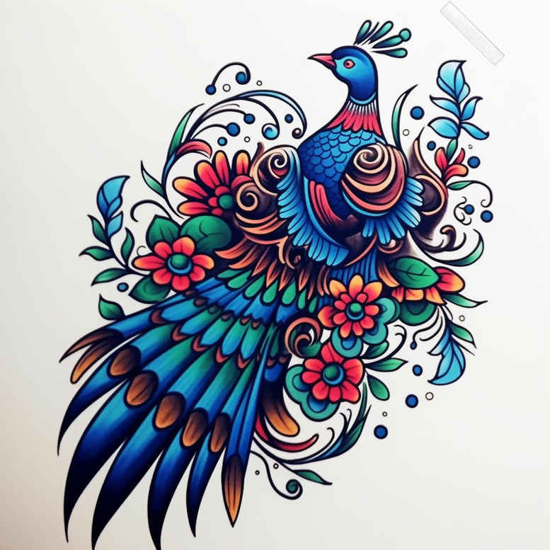 AI-generated tattoo project concept presents a vibrant peacock entwined with floral and foliate elements in a bold, ornamental composition. The centerpiece is a proud peacock rendered with a cascade of cobalt, azure, and teal plumage, accented by coral reds and warm oranges. The bird is framed by stylized blossoms and leaves, each petal and vein defined with clean, precise lines that emphasize the graphic patterning characteristic of contemporary ink design. This piece nods to traditional tattoo aesthetics while embracing modern execution: bold contours anchor the silhouette, while inner shading and gradient color build depth to read clearly on skin. The tail feathers arc outward in a sweeping motion, forming a natural frame for the blossoms, while the flowers echo the curves and spirals found in Japanese style tattoo and ornamental motifs, giving the tattoo design a cross-cultural appeal within flower tattoos and exotic wildlife themes. The color palette is saturated yet balanced, with black ink outlining the composition and strategic shading to create dimension on skin, ensuring readability in a range of placements from shoulder to back. The symbolism is evocative: the peacock represents beauty, dignity, and renewal, while the floral motifs suggest growth, resilience, and spiritual awakening, making this a meaningful tattoo concept for someone seeking a narrative conveyed through ink. The graphic patterning is a defining feature—interwoven petals, curling tendrils, and feather motifs create a textured surface that remains crisp with age, and the design adapts well from small tattoos to larger body art pieces. This concept is suitable for AI-generated tattoo project discussions and serves as a versatile starting point for a custom tattoo design that blends nature, culture, and artistry, with scalable impact for salons seeking a fine-line tattoo or a bold color statement. It also nods to lotus flower tattoo symbolism and the broader themes of meaning and ink in the tattoo world, while remaining adaptable to rose tattoo design motifs and other flower tattoos for a personalized piece.