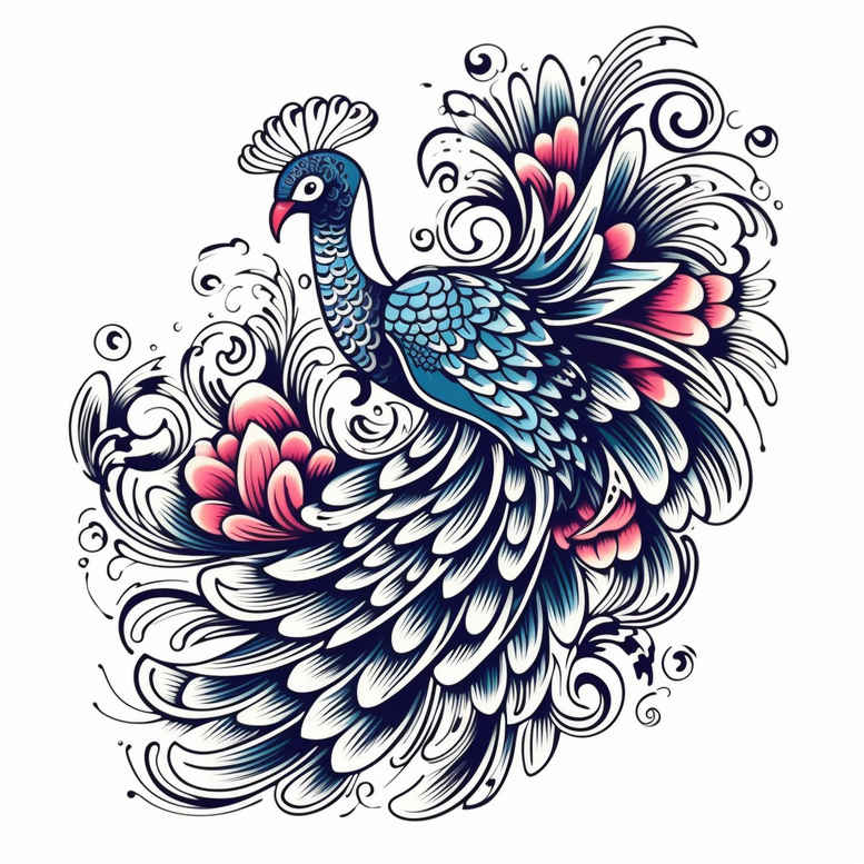 This image presents an AI-generated tattoo project concept built around a majestic peacock, whose plumage unfurls in a sweeping, ornamental pattern. The design embraces a bold yet delicate aesthetic, with crisp fine line work, graceful curves, and intricate feather details that read clearly at a distance while inviting closer inspection up close. The palette centers on blue and deep indigo accents, reinforced by black outlines, and punctuated by soft pink floral touches that weave through the tail like blossoms caught in a breeze. The resulting composition feels both naturalistic in suggestion of motion and highly stylized as a pattern-driven piece, making it suitable for larger placements such as the back or thigh, or scalable down for a refined forearm or calf tattoo. The motifs are intentional: the peacock stands for beauty, renewal, and pride; the flowing plume implies movement, continuity, and growth; the flowers provide balance and tenderness to offset the bird’s grandeur. From a technique standpoint, the design leans into fine line tattoo sensibilities, with restrained shading and selective color blocks to preserve legibility across sizes. The pattern-like arrangement allows for a cohesive, repeating rhythm across the canvas, while keeping the individual elements recognizable. This concept aligns with modern custom tattoo design trends that welcome hybridization of Japanese style influences, floral motifs, and creature imagery into a single, harmonious piece. As an AI-generated tattoo project, it serves as a versatile blueprint that tattooists and clients can adapt—adjusting scale, placement, and color saturation to suit personal symbolism, skin tone, and style preferences. In summary, the piece communicates meaning through symbolism, craftsmanship, and a confident use of color, offering a meaningful tattoo design option for those seeking a striking flower-and-avian motif in black and grey, or full color ink.
