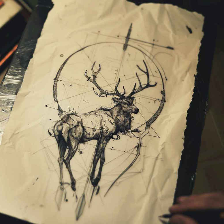 AI-generated tattoo project concept: a stag with expansive antlers stands within a circular ring, drawn in black ink on a parchment-toned surface. Rendered as a fine-line tattoo study, the piece relies on precise contour lines, subtle shading, and restrained cross-hatching to convey texture in fur and the musculature of the neck without heavy fills. The circle behind the deer functions as a geometric frame, introducing rhythm and balance that anchors the composition while preserving negative space for a clean skin translation. Symbolically, the stag embodies majesty, resilience, and a connection to forest origins, while the circular motif suggests continuity and protection, making the design meaningful as a personal emblem or tribute piece. Technically, the design leans into the hallmarks of black-and-grey tattooing: crisp linework, delicate gradients, and controlled contrast suitable for a small to medium tattoo design on forearm, calf, or shoulder. The concept also nods to Japanese style tattoo sensibilities through composition and restrained symbolism and pairs well with floral motifs for a balanced sleeve or backpiece. For studios seeking a template, the concept offers a clean silhouette with adaptable scale, allowing adjustments to line weight and shading to suit different skin tones and placements. As an AI-generated tattoo project, it demonstrates how a wildlife motif can be rendered with modern minimalism while maintaining depth through line economy and geometric framing. The result is a versatile tattoo design that can be realized as a standalone piece or expanded with additional elements, ensuring a timeless silhouette that ages gracefully. With precise shading and patient line work, the ring can host micro-detail such as dotwork within the negative space, offering options for either a realistic or stylized interpretation.
