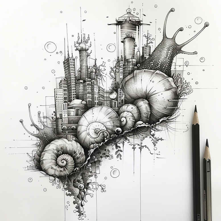 This AI-generated tattoo project concept blends natural form with urban architecture in a refined, fine-line technique executed in black and grey. The focal element is a sequence of snail shells, their convex spirals stacked and threaded into a vertical column that doubles as a stylized cityscape, with slim towers, arches, and spires emerging from the muted shadows. The result is a dreamlike fusion of biomorphic geometry and architectural silhouette, readable as both a standalone study and a potential tattoo design. The linework emphasizes clean, uninterrupted contours, while layering delicate shading and stippling to create depth without overwhelming detail, ensuring the design remains legible on skin. Symbolically, the snail shell embodies resilience and the cycles of time, while the ascending skyline hints at growth, ambition, and the persistence of memory within the urban environment. The recurring spirals generate a pattern-like rhythm that anchors the composition, a nod to graphic patterns common in contemporary tattoo design yet interpreted through a fine-line and black-and-grey lens. The concept is modular: it can be adapted for a small study on the forearm, an elegant inner-forearm piece, or scaled into a larger back or sleeve, with space left for personal initials or subtle textures to enhance meaning. From a practical standpoint, the grayscale palette supports a versatile placement and ages well with the skin while preserving line clarity across sessions. For artists and clients seeking meaningful tattoos, this concept translates into a thoughtful custom tattoo design that leverages modern ink techniques, line accuracy, and shading to deliver timeless body art; its mix of nature and city, with a clear focal point and spiraling motif, also makes it a compelling option for a cover-up project if desired.