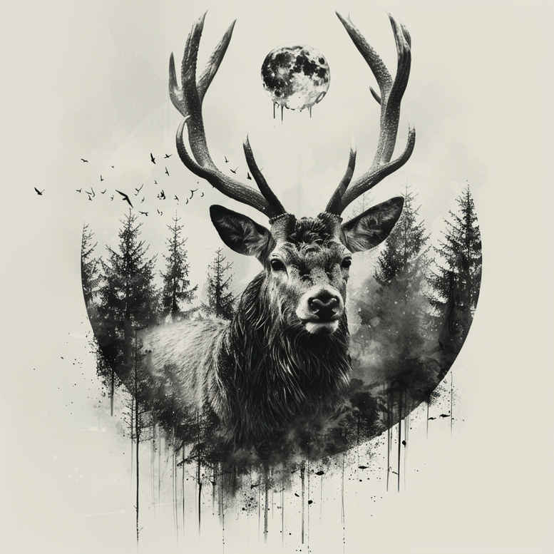 AI-generated tattoo project: This cover-up ready deer forest motif demonstrates how a bold, monochrome composition can transform existing skin marks into a cohesive body art statement. Rendered in black and grey with a realistic yet expressive approach, the central deer head anchors the design, its gaze conveying quiet strength while the antlers extend into a sparse forest silhouette that dissolves into controlled drips. The treatment balances solid blacks with subtle gradient shading to render fur texture, bone contours, and the treeline with convincing depth, ensuring legibility on skin and longevity over time. The graphic patterns formed by the trees and splatter elements add a contemporary edge, while preserving a natural, wildlife-inspired aesthetic that sits well with tattoo design trends favoring meaningful tattoos. Symbolically, the deer evokes intuition, renewal, and protective energy, while the forest motif embodies endurance and a bond with nature—an appealing narrative for those seeking a personal, meaningful tattoo. For practitioners, the piece offers clear guidelines: a strong focal point, deliberate contrast, and a built-in cover-up potential that can mask previous ink while yielding a striking silhouette on the shoulder, back, or chest. In terms of style, this design straddles realism and illustrative technique, making it adaptable to Japanese-style ink or a more classic black-and-grey realist rendering. The palette remains restrained to black, grey, and negative space, aligning with fine line tattoo sensibilities for subtle details within a larger, impactful composition. It also sits alongside related motifs such as lotus flower tattoo, infinity tattoo, and tribal tattoo patterns as potential variations, or as a starting point for a custom tattoo design tailored to the wearer”s anatomy and tattoo history. While the imagery leans toward a natural, forested aesthetic, the layered textures, accent lines, and pattern-like shading ensure a graphic, tattoo-ready result that can be tuned for a confident, contemporary cover-up project, and this AI-generated concept underscores ongoing interest in AI-generated tattoo projects within professional studios.