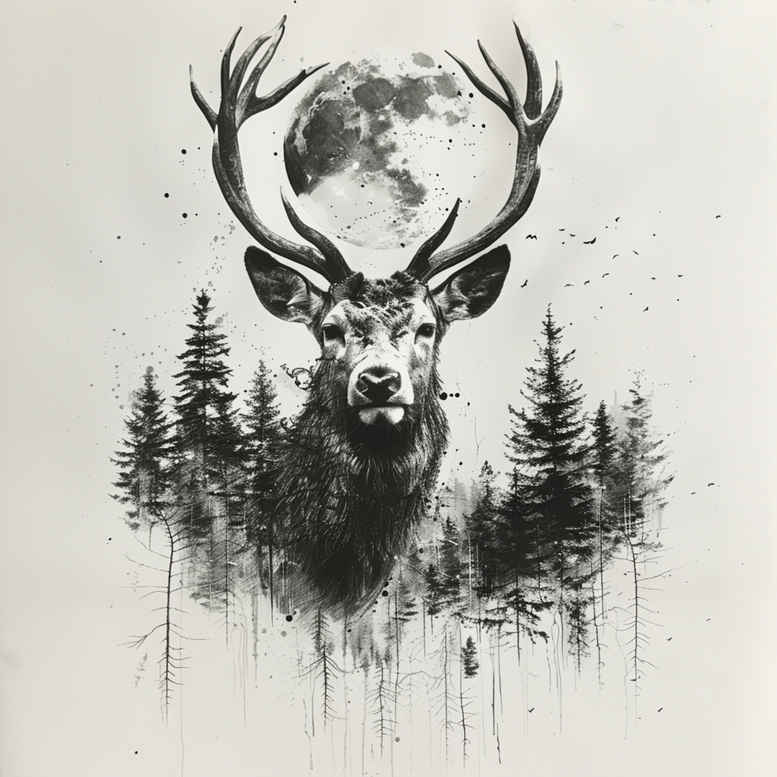 This AI-generated tattoo project presents a stag head with expansive antlers rising from a misty forest, executed in a restrained black and grey watercolor style. The composition centers on a bold, highly legible silhouette of the deer, while the surrounding pines and atmospheric haze are treated with soft washes and irregular splatters that lend texture without compromising clarity. The pattern-like textures—drips, speckling, and wispy tree silhouettes—create a visual rhythm that reads as both contemporary and timeless, making the piece suitable for a range of placements from the forearm to the back. Symbolically, the stag embodies endurance, nobility, and renewal, and its interaction with the forest motif speaks to a personal narrative of resilience and nature-connected meaning. Technically, the design offers a clear focal point with crisp line work on the antlers and face, supported by layered gray washes to establish depth and form, enabling a realistic yet artistic treatment that ages gracefully as a black and grey tattoo. This concept aligns well with custom tattoo design workflows, allowing artists to adapt spacing and scale while preserving the integrity of the stag and forest elements. As a meaningful tattoo design, it can pair with floral motifs or Japanese-inspired background textures to broaden its storytelling potential, or stand alone as a refined body art piece. For those seeking a cover-up solution, the composition’s bold silhouette and flexible negative space make it an excellent choice, with ample opportunity to conceal prior ink beneath a natural, pattern-rich shield. Note that this is an AI-generated tattoo project, designed to inspire a unique, professional body art outcome that blends realism with impressionistic texture and ink dynamics.