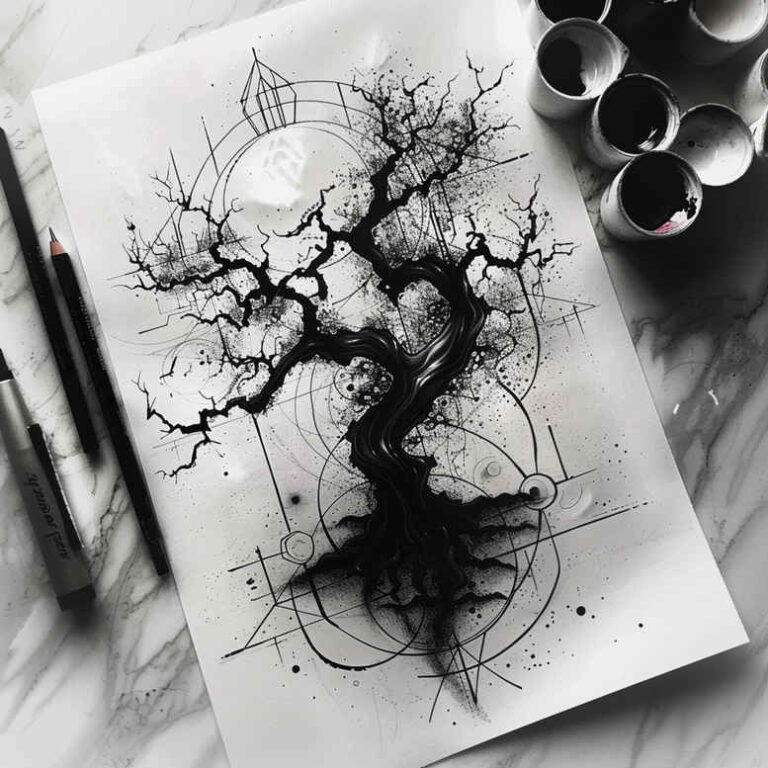 This AI-generated tattoo project presents a bold, dark tree design conceived as a cover-up-friendly concept. Rendered in black and grey with dense shading and intricate line work, the composition centers on a gnarly tree whose twisting branches dissolve into roots, suggesting themes of endurance, rebirth, and hidden depths. The piece works well as a cover-up due to its heavy silhouette and strong negative space, capable of masking previous tattoos while preserving a dramatic focal point. The sketch appears on paper, with pencil outlines and graphite-like shading that mimic the texture of real ink on skin. Technique emphasizes fine line precision for the branches and roots, contrasted with broader shading to build depth and a realistic, skin-friendly effect. The mood combines natural Gothic aesthetics with a contemporary Japanese-influenced respect for form, allowing it to function as a standalone tattoo study or a component in a larger piece such as a back or forearm sleeve. As a custom tattoo design concept, it invites adaptation to fit different placements while maintaining the central tree motif that symbolizes resilience, growth, and personal transformation. The visual language supports meaningful tattoos that speak to endurance and rebirth, and it can be enriched with optional elements like lotus flower tattoo accents or subtle floral vines if desired. Because the image originated as an AI-generated concept, it serves as an excellent starting point for a professional tattoo artist to develop a finalized piece, with guidance on line weight, negative space, and ink density to ensure legibility on skin. In practical terms, the dark, ink-dense approach is especially well-suited for a cover-up, where previous work can be seamlessly integrated into the tree’s shadow, while remaining visually striking. The confluence of black and grey tones, precise line work, and a powerful silhouette makes this tattoo design a compelling option for those seeking a bold, long-lasting body art statement, whether pursued as a small, symbolic piece or a dramatic larger work in the realm of fine line tattoos and nature-inspired themes.