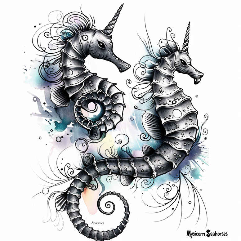AI-generated tattoo project concept featuring two seahorses rendered in black and grey linework with blue watercolor accents and flowing swirls. This tattoo design blends meticulous fine line technique with painterly washes, yielding a balanced composition that works on the shoulder, back, or calf. The seahorses symbolize patience, companionship, and resilient grace, facing one another as a reminder of harmony and mutual support. Bold outlines anchor the figures while soft gray shading creates depth, and the blue washes provide a marine mood that shifts with light. Surrounding swirls, bubbles, and tendrils weave through the scene, adding movement and layering without crowding negative space. From a technical perspective, the piece prioritizes clean line weight, controlled gradient transitions, and subtle texture to achieve a refined black and grey look with blue highlighting. The concept scales from small, single-session tattoos to larger, sleeve-ready works and can be adapted into Japanese-style or tribal treatments if desired. It embraces the current trend toward meaningful tattoos that pair natural imagery with restrained symbolism, making it compatible with rose tattoo design or lotus flower tattoo motifs if the client wishes to extend the composition. The design is positioned to serve as a custom tattoo design that resonates with fans of flower tattoos, sea life, and nature-inspired body art, and it pairs well with broader body art plans. Clinically sharp lines contrast with painterly color, producing a versatile piece suitable for realist or stylized interpretation, while keeping the composition legible on various skin tones. This AI-generated tattoo project underscores precision in line work, balance between ink density and space, and a watercolor-inspired ambiance intended to inspire both tattoo studios and clients seeking a contemporary black and grey with blue accent approach.