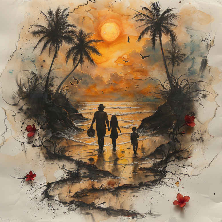 An AI-generated tattoo project concept rendered in a watercolor-inspired style, this design presents a contemplative beach scene suitable for tattooing. The composition centers on two dark silhouettes walking along a sunlit shore, framed by slender palm trees and a glowing horizon. A radiant sun sinks into warm orange and gold tones, casting reflections across the calm sea and onto the pale sandy foreground. Red flowers punctuate the foreground, providing a bold color contrast that enhances the composition without overwhelming it. The scene employs soft washes, fluid edges, and deliberate negative space to emulate brushwork, making it adaptable to fine line tattoo techniques or broader color application. The figures are treated as silhouettes rather than detailed portraits, inviting personal interpretation while preserving legibility on skin. This concept carries meaning of companionship, journey, and transition as the day closes and a new path appears toward the horizon. Technically, it can be realized as full-color or black-and-grey depending on client preference, and can be scaled from small tattoos to larger back or shoulder pieces. For a Japanese style influence, the palm fronds and horizon could be stylized with subtle line work, while the sun could be rendered as a radiant disc. The palette and composition are also conducive to a lotus flower tattoo or flower tattoos motif, should the client wish to weave additional symbols of growth and renewal into the design. As a stand-alone tattoo design, it stands well for meaningful tattoos and can be adapted into a custom tattoo design that suits individual skin tones and anatomy. This is an AI-generated tattoo project concept, intended to inspire artists and clients alike; if used as a cover-up, the bold dark silhouettes provide a solid foundation for concealing existing ink while the lighter sky and water offer a harmonious counterpoint. In short, this tattoo concept merges natural imagery with human presence, offering a timeless, versatile piece for body art, ink, and meaningful tattoos.