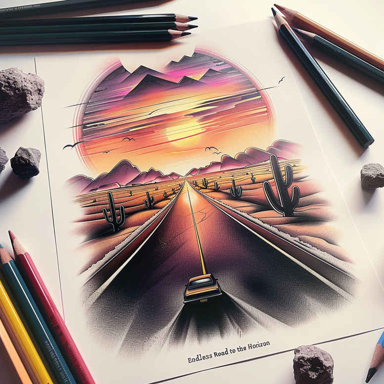 Presented as an AI-generated tattoo project concept, this image offers a vibrant, watercolor-inspired landscape built around a long road that vanishes toward a glowing horizon. The central axis is the road, with jagged mountains in the distance and a radiant sunset washing the sky in pink, purple, and amber. Desert silhouettes of cactus flank the roadside, framing the perspective and enhancing the sense of journey. The palette emphasizes soft washes and layered gradients, while crisp outlines anchor major shapes so the scene remains legible on skin. Although framed as a landscape fantasy, the concept translates to a versatile tattoo design suitable for large canvases or modular pieces, and it invites adaptations from bold colorwork to refined black and grey shading. For ink enthusiasts, the idea accommodates a range of approaches: a fine line tattoo interpretation with delicate contouring, a realistic rendition that captures color depth and texture, or a graphic Japanese-style flowering motif integrated around the horizon. The desert motif also supports symbolic readings—road as life’s path, mountains as obstacles overcome, and the sunset as renewal. The design can be accompanied by lotus flower tattoo or rose tattoo design accents along the roadside, or extended with infinity motifs to emphasize continuity. As an AI-generated tattoo project, it serves as a modern reference for a custom tattoo design process, providing a springboard for client-artist collaboration while preserving the energy and mood of the scene. In practice, artists can tailor the color saturation, edge definition, and scale to suit small tattoos or a full back piece, ensuring the composition remains readable and impactful across skin and ink. This concept aligns with meaningful tattoos and versatile body art, and it invites exploration of how ink can capture memory, opportunity, and destination.