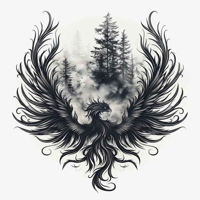 This black and grey composition presents a pair of stylized wings unfurling around a moody forest silhouette, offering a bold, cover-up-ready tattoo design with strong contrast and narrative depth. Executed in dense, layered black ink, the wings feature flowing quills and intricate feather pattern that conveys movement and texture, while the forest backdrop provides negative space and atmospheric shading that enhances readability on the skin. The overall silhouette leans toward an illustrative, fine-line aesthetic; crisp linework sits within a tonal gradient that softens edges and preserves legibility as the piece scales. The concept fuses wing symbolism—freedom, protection, ascent—with an earthly forest scene that evokes mystery, resilience, and personal renewal. For clients seeking meaningful tattoos, this design speaks to transformation and endurance, with the union of sky and woods suggesting a journey that can be expanded or simplified to suit placement. It performs especially well on larger canvases such as the back, chest, or shoulder blade, where the wings can span across the top and the forest can anchor the center. From a technique perspective, the pattern-like feather detailing creates texture and rhythm, yielding a cohesive read from afar and close inspection up close. As an AI-generated tattoo project, this concept demonstrates a ready-to-tattoo foundation that a professional artist could customize. The description emphasizes that the image is dark and cover-up friendly, making it a versatile template for clients with prior ink or scars. In practice, the design accommodates various Japanese style or tribal hints if desired, while maintaining the core black and grey, realistic tattoo potential. In sum, it embodies bold visual impact, meaning, and adaptivity for small or large formats, aligning with trends in fine line and black and grey tattoo design, while offering a powerful cover-up option and a timeless body art statement.