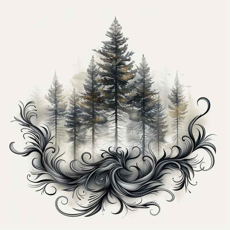 AI-generated tattoo project depicting a monochrome forest motif where tall pine trees rise from a base of ornamental swirls. Rendered in black and grey, the piece blends natural form with decorative patterning to create a cohesive design suitable for a sleeve, back piece, or a meaningful small tattoo. The central image centers on a slender grove of pine trees, shaded with soft gradients to convey depth, while curling, floral-inspired tendrils sweep along the lower edge like waves. The composition relies on fine line precision and restrained shading to achieve a refined look, with the swirling motifs acting as a unifying frame around the trees. This pattern-rich concept nods to Japanese style and tribal tattoo aesthetics while staying contemporary and versatile for a wide range of placements. Techniques include stippling to texture bark, feathered shading on needles, and careful negative space to enhance contrast. As a meaningful tattoo concept, it can symbolize resilience, growth, and the passage of time, with the forest motif representing endurance and renewal. Because the artwork is black and grey, it is particularly well-suited for a cover-up, allowing for generous negative space and smooth blending with existing ink, making it a strong candidate for concealing prior work. The design can function as a standalone tattoo design or be integrated into larger body art, with potential to adapt into related ideas such as a lotus flower tattoo, infinity tattoo, or rose tattoo design for personalization. For small tattoos, the upper portion can be condensed into fine line details, while the lower swirls can be extended to link with other imagery. Overall, this AI-generated concept demonstrates how nature-inspired forms translate into refined body art that remains legible across scales; the patterning ensures visual rhythm and cohesion across all visible elements, making it an excellent option for someone seeking a cover-up-friendly tattoo design that preserves meaning while transforming prior ink.