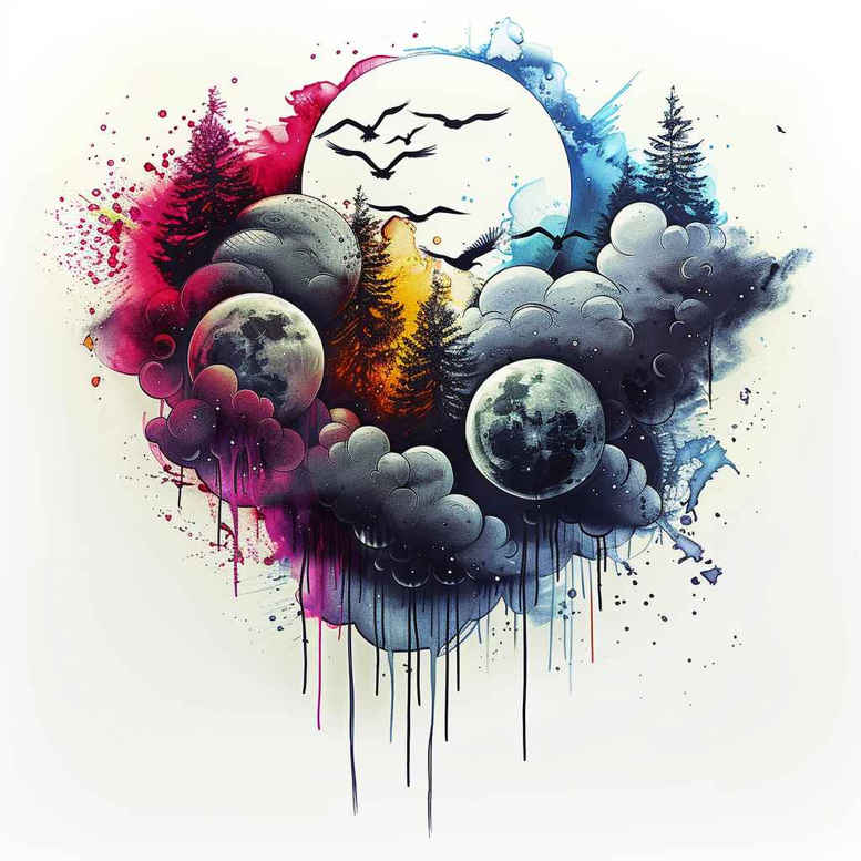 AI-generated tattoo project concept presented as a cosmic watercolor composition. The design explores celestial bodies using bright, saturated pigments and soft edge transitions that mimic watercolor washes. Dominant elements include round moons and planets arranged among billowing clouds, with ink drips extending downward to suggest motion and spontaneity. The piece balances organic painterly textures with clean linework to preserve readability as a tattoo design. Execution relies on gradients to convey dimensionality on the skin, while the watercolor technique creates a luminous, almost ethereal atmosphere. The concept invites a personal interpretation—cosmic journeys, cycles of time, or a dreamscape—making it a strong candidate for small-to-medium placements such as the upper arm, shoulder blade, or calf. For practical tattoo considerations, the soft gradients require careful shading and color retention; the drips and splashes introduce dynamic movement without overpowering central forms. This AI-generated tattoo project embraces a modern, illustrative style, leveraging watercolor to render moons and clouds with depth. In terms of symbolism, moons and planets evoke cycles, exploration, and the vastness of the universe, while clouds symbolize transition and flux. From a stylistic perspective, the design blends celestial geometry with painterly softness, allowing future modifications: additional planets, stars, or botanical motifs could be integrated in a custom tattoo design process. As an AI-generated concept, it provides a flexible starting point for clients seeking a meaningful tattoo that marries dreamlike ambiance with planetary iconography, suitable for small to medium pieces in color or adaptable to black and grey. The piece demonstrates how ink can translate a cosmological story into wearable art and can be aligned with broader meaningful tattoos, such as infinity tattoo, tribal tattoo, or rose tattoo design, if desired in a cohesive sleeve or backpiece. AI-generated concepts like this offer a practical, customizable foundation for tattoo projects across skin tones and body locations.