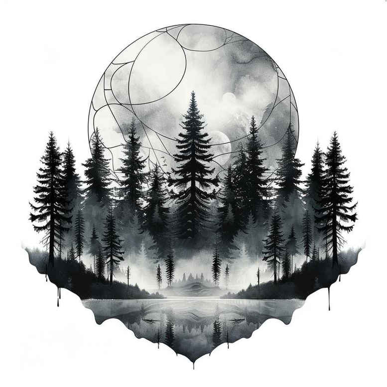 AI-generated tattoo project concept of a moonlit forest circle rendered in black and grey, designed as a cover-up-friendly composition. The central circle frames a dense stand of pine silhouettes that rise in a jagged horizon, while a pale moon peeks through mist and a glass-smooth water surface reflects the scene. The design relies on soft gradients and sharp negative space to create depth without sacrificing readability on the skin. The overall mood is tranquil yet dramatic, making it suitable for larger placements or as a discrete, fine line, small tattoo anchor depending on scale. Key elements include the circle motif, towering trees, a crescent moon, and reflective water, all executed in a cohesive black and grey palette. This concept embraces a traditional-to-modern fusion—Japanese-inspired restraint in linework, combined with contemporary realism in shading—resulting in a tattoo design that feels both timeless and wearable. For meaning, the forest can symbolize endurance and solitude, the moon change and tides, the water reflection introspection; together they convey a journey through darkness toward clarity. As a meaningful tattoo design, it works as a cover-up where darkness provides the canvas to mask prior artwork, while the circular composition offers a timeless, balanced silhouette. In practice, artists can adapt the density of trees, add subtle stars, or tweak the circle boundary for personalized placement. This is an AI-generated tattoo project, intended to inspire clients seeking a bold, nature-inspired body art piece, with keywords like tattoo, tattoo design, meaningful tattoos, fine line tattoo, lotus flower tattoo, infinity tattoo, tribal tattoo, rose tattoo design, small tattoos, flower tattoos, custom tattoo design, Japanese style tattoo, black and grey, realistic tattoo, body art, ink.