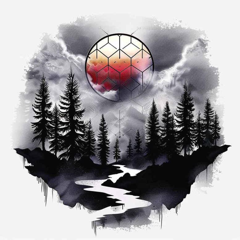 AI-generated tattoo project envisions a moody forest landscape in black and grey watercolor tones, dominated by a bold circular moon etched with a graphic hex pattern. In the foreground, stark pine silhouettes align along a sinuous river while distant mountains and a misty sky create depth through graded washes. The composition uses a mix of negative space and dense ink to achieve a painterly yet precise look, with the geometric moon providing a contemporary counterpoint to organic forms and a clear focal point. The hexagonal pattern on the moon introduces a graphic motif that can be repeated as a theme across a larger piece or adapted into line-work as fine detail. The palette remains restrained to black and grey to maximize contrast and longevity, with subtle blue-grey undertones and delicate stippling to imply mist. Symbolically, the forest evokes resilience, the river represents journey, and the moon signifies cycles and time; the juxtaposition of natural scenery with a synthetic pattern probes the dialogue between nature and design. This concept is suitable for cover-ups due to strong values and broad areas of solid shading that can obscure prior markings, while still allowing for a modern Japanese-style or traditional influence in future iterations. As a tattoo design, it can be realized as a bold back piece, a forearm scene, or a small meaningful composition in black and grey, aligning with meaningful tattoos, fine line tattoo, and realistic tattoo approaches through careful ink distribution. By integrating classic landscape imagery with a distinctive geometric accent, this AI-generated tattoo project demonstrates how ink, line work, and shading converge to produce body art that is both timeless and contemporary.