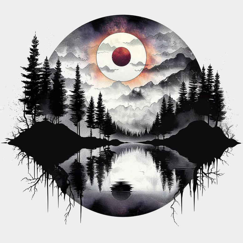 AI-generated tattoo project concept featuring a circular landscape rendered in black and grey silhouette, designed as a cover-up-ready tattoo design. The image presents bold pine-tree silhouettes along a mountain range, a tranquil lake with a clear reflection, and a red sun disc rising behind the ridgeline, all contained within a perfect circle. The foreground trees frame the lake and mountains, while negative space preserves readability on older skin. This cover-up-oriented concept benefits from dense black ink and simple shapes that can mask underlying lines, yet with subtle sky gradients to convey atmosphere. Key elements: sun, mountain, lake, tree, reflection. From a technique perspective, the design relies on solid black shapes and crisp edges, suitable for black and grey realism, but adaptable as a Japanese style tattoo or custom tattoo design for other sizes. The symbolism blends renewal and grounding: the sun as vitality, mountains as endurance, and the lake’s reflection inviting introspection, a meaningful tattoo for someone seeking a personal narrative in body art. The composition scales well from small tattoos to larger forearm or back pieces and can be integrated with floral motifs like rose tattoo design or lotus flower tattoo, should the client desire. It embraces both classic nature motifs and modern silhouette aesthetics, making it a versatile base for a tattoo design portfolio. This concept, as an AI-generated tattoo project, underscores the potential of technology-assisted art while keeping the focus on craft, ink, and meaning. If very dark skin is a concern, this approach is especially suitable for a cover-up due to the dense black shapes; light shading can help blend edges for a seamless finish.
