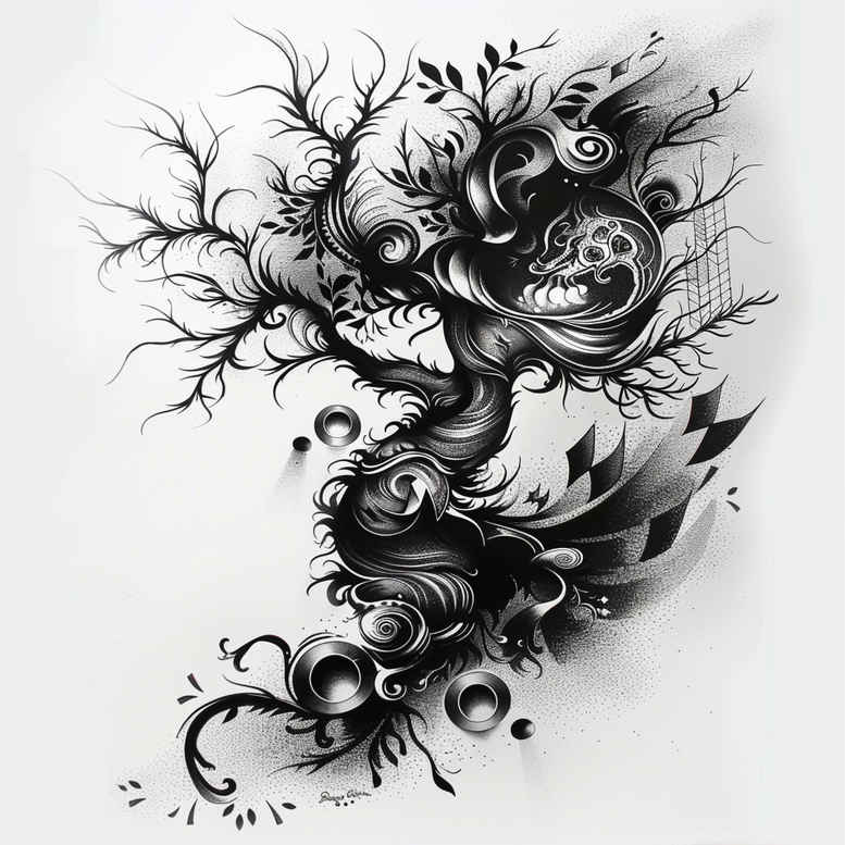 This AI-generated tattoo project presents a cover-up ready concept built around a dense, dark pattern of swirling florals. Executed in black and grey, the design weaves a continuous stream of tendrils, petals, and leaves into a cohesive motif suitable for concealing prior work while preserving the integrity of line work. The central figure reads as a lotus-flower inspired bloom, with fine-line stems and deep shading that fade into negative space, offering a versatile canvas for placements from shoulder to back. The piece emphasizes motion, with curling filigree that seems to rise from a shadowy base, echoing styles from Japanese and tribal tattoo aesthetics while remaining adaptable to other traditions. The approach uses graduated grays to create depth, from near-ink solid blacks to soft, smoky grays that render the petals and leaves with a lifelike, sumi-e influenced feel. As an AI-generated tattoo project, the concept invites customization for scale, orientation, and detail density, while maintaining a cohesive pattern that reads clearly at both small and large sizes. The design integrates a pattern-rich flow, where repetition in contour lines creates rhythm, making it suitable for covering over existing imagery or scars. For tattoo design enthusiasts seeking meaningful tattoos, this piece signals a blend of lotus symbolism—representing purity and resilience—with a contemporary, fine-line technique. The result is a versatile black and grey tattoo design that can be adapted to the back, shoulder, or forearm; it appeals to fans of floral motifs, symbolic ink, and precise line work. It remains a strong candidate for a cover-up due to its dark base and layered shading, and can be adjusted to emphasize either the floral silhouette or the decorative pattern depending on client needs. In short, this is a robust, AI-assisted concept primed for real-world tattoo projects across sizes.