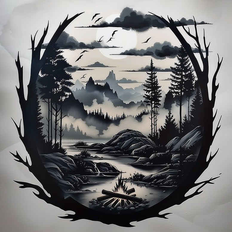 AI-generated tattoo project concept presenting a nocturne forest circle, a landscape rendered in black and grey within a circular frame. The composition relies on bold silhouettes and subtle gradations to create depth while preserving clarity for a lasting tattoo design. Central to the image is a winding river that threads toward distant mountains, with a small wooden bridge anchoring the foreground. Surrounding trees form a jagged oval, carving a natural border that also serves as a built-in cover-up shield for existing ink. The piece reads as a modern yet timeless tattoo design, balancing negative space and dense ink to achieve mood and precision. In terms of technique, smooth transitions between blacks and grays, crisp edge work on the frame, and careful layering of shadows convey distance and atmosphere. The motifs—tree, mountain, river, bridge—offer versatile symbolism: endurance, journey, serenity—meaningful tattoos that fit small tattoos or flower tattoos, or a broader rose tattoo design motif, and can cross into infinity tattoo symbolism. The black and grey palette aligns with a realistic tattoo approach, while the circular composition nods to Japanese style tattoo sensibilities and a refined silhouette aesthetic. This concept is easily adaptable to full or partial sleeves or chest placements and can be expanded into fine line tattoo accents if desired, increasing its custom tattoo design potential. The overarching goal is to deliver a tattoo-ready concept that respects line integrity, shading, and readability across skin tones, ensuring it remains compelling as ink, even as a cover-up piece. Note that this is an AI-generated tattoo project concept, intended for professional discussion and refinement in tattoo portfolios.