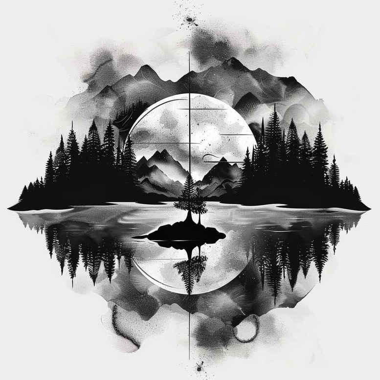 AI-generated tattoo project presenting a forest lakeside scene bound within a perfect circle, rendered in black and grey. The composition reads as a mirrored landscape: a dense line of pine silhouettes along the shore, a glassy body of water reflecting the treeline and the circular contour, and a pale sun hovering behind the horizon. The design blends natural imagery with geometric mandala cues, producing a graphic pattern that can function as a bold standalone tattoo or a refined cover-up piece. Executed with crisp black ink and a soft grey wash, the silhouettes are bold with subtle grading to convey depth and atmosphere. The circle serves as a containment device that anchors the composition and creates a symmetrical rhythm, ideal for placement on the upper back, chest, shoulder, or forearm. If applied as a cover-up, the dense black mass of the trees and the consolidated circular frame can effectively mask underlying scars or older tattoos while preserving negative space for future ink. The image is an AI-generated tattoo project exploring the intersection of nature imagery and mandala geometry; it demonstrates how a landscape can be reinterpreted into a tattoo design with both meaning and aesthetic impact. Meaningful tattoos often use nature motifs to symbolize resilience, renewal, and balance; this piece translates those ideas into a compact motif suitable for small tattoos or as part of a larger body of work. The black and grey palette reinforces timeless readability on skin, while the restrained contrast ensures longevity across skin tones. As a custom tattoo design concept, it suits influences from Japanese style tattoo through its emphasis on line clarity and circular rhythm, yet the motif remains broadly applicable to modern black and grey realism. For placement, the central circle can anchor an inner forearm or ribcage composition; for someone seeking a bold, cover-up friendly piece, this design excels due to its density and defined silhouette. In short, this tattoo design merges landscape symbolism, geometric patterning, and precise line work to deliver a versatile, AI-generated study in monochrome body art; it speaks to fans of meaningful tattoos and compact, high-contrast imagery. If the design is adopted as a cover-up, its dark core and layered shading make it particularly well-suited to conceal older work while offering new possibilities for future tattoo ideas.