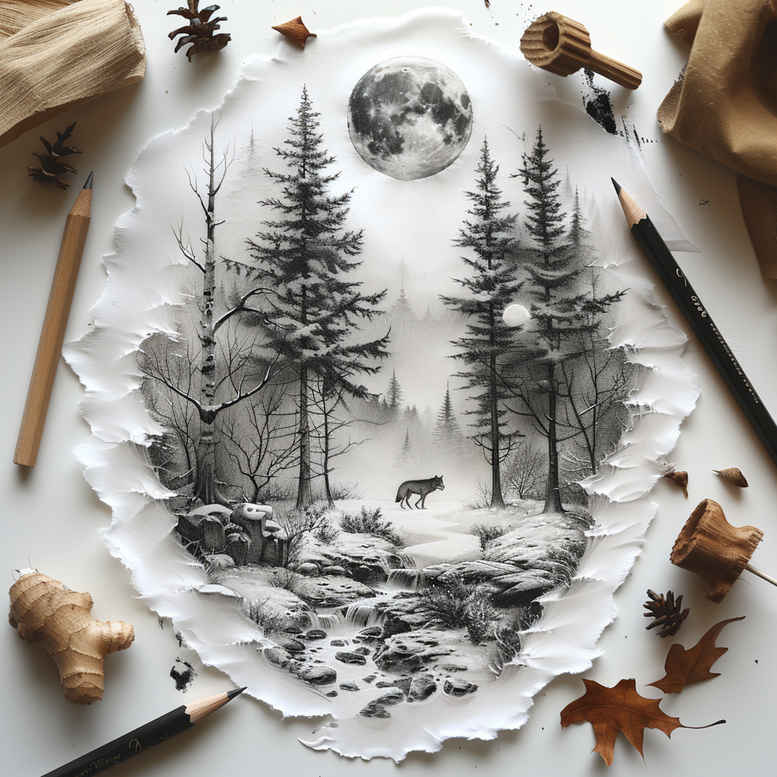 This circular medallion-style composition presents a moonlit forest scene executed in black and grey ink, dominated by tall pine trees, a grazing deer, a winding river, and jagged rocks that mirror the rugged shore. The negative space around the silhouettes creates a contemplative balance; the stark contrast sharpens the linework and invites closer inspection of the brush-like washes that soften the edges. The central moon casts a pale glow that guides the eye through layered forest and water, suggesting a narrative of quiet endurance and seasonal cycles. The piece reads as a realistic tattoo with a touch of atmospheric ink wash, suitable for both large canvas work and finer line accents in a smaller tattoo design. The trees’ branches form a natural frame, while the deer provides a focal point that embodies stillness and resilience, offering a window into personal journeys and the mysteries of wilderness. From a technical perspective, the design relies on bold black silhouettes contrasted with lighter gray washes to achieve depth, dimension, and motion in the water, with texture suggestions that mimic bark, moss, and stone. For a tattoo collector seeking a meaningful tattoo, this motif can symbolize perseverance, exploration, or a bond with nature; it also fits well with broader meanings like solitude, memory, or returning home. The composition can be adapted for various scales, from a refined fine line tattoo on a forearm to a dramatic back piece, with potential to incorporate additional motifs such as a lotus flower tattoo or infinity symbols along the riverbank in a subtle, integrated fashion. Given its dark, high-contrast nature, the design is particularly suitable as a cover-up—its bold silhouettes can effectively obscure prior marks while delivering an artful transition to new ink. Encapsulating a spectrum of tattoo styles, this concept sits at the intersection of realism and monochrome mood, offering flexibility for artists to explore Japanese-style influence through careful shading, or to lean into tribal-inspired linework for a more graphic interpretation. As an AI-generated tattoo project, this design is intended as a starting point for collaboration, allowing clients to customize tree species, animal presence, or the density of the water to reflect personal memories. In practice, it translates well to meaningful tattoos that honor place, kinship, and personal quests, and it stands as a robust example of black and grey body art, versatile enough to adapt to small tattoos or expansive pieces while maintaining clarity of line and impact of shadow. The piece also demonstrates how nature-inspired imagery can be personalized for cover-up contexts, balancing aesthetic depth with practical concealment, and aligning with current trends in tattoo art that favor bold silhouettes, timeless motifs, and enduring symbolism.