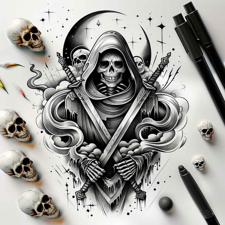 This AI-generated tattoo project presents a dark, highly graphic representation of a hooded grim reaper, its skeletal features rendered in black and grey with dramatic shading. The central figure grips two swords that cross over the chest, creating an emblematic X that anchors the composition and draws the eye toward the figure’s hollow gaze. Surrounding elements include scattered skulls and a crescent moon peeking from behind the hood, while the robe folds, hood shape, and smoky negative space add movement and depth. Executed with a masterful blend of broad tonal blocks and fine line detailing, the piece balances bold silhouette work with intricate linework that rewards close inspection, making it suitable as a tattoo design for fans of realistic black and grey body art, as well as for those exploring more graphic, pattern-ready motifs. The dark palette supplies a timeless aesthetic compatible with Japanese style tattoo influences and Gothic or tribal sensibilities, enabling versatile placement on the body such as the back, chest, or sleeve, and also serving well as a cover-up piece where previous ink needs concealing beneath a cohesive new motif. As an AI-generated tattoo project, it showcases contemporary render capabilities, offering a realistic tattoo appearance with smooth gradients, crisp edges, and seamless transitions between shading zones. For those seeking a small tattoo or a larger work, this concept can be adapted into variations—different sword orientations, alternative skull expressions, or additional ornamental elements—while maintaining the core motif of mortality and defiance. In terms of symbolism, the grim reaper embodies the inevitability of death and the discipline to confront it with courage, while the crossing swords suggest resilience and defiance of fate; the skulls symbolize memory and the passage of time, and the moon adds a celestial dimension that hints at cycles and renewal. This piece is expressly designed to be cover-up-ready, with dense black masses strategically positioned to mask older tattoos while preserving legibility and composition on skin, yet it remains crisp and legible at a variety of scales, from a bold back piece to a refined forearm design; the final result is a striking, story-driven tattoo design that resonates with those seeking meaningful tattoos, fine line precision, or a strong black and grey statement piece, and it intentionally aligns with keywords such as tattoo, tattoo design, meaningful tattoos, fine line tattoo, lotus flower tattoo, infinity tattoo, tribal tattoo, rose tattoo design, small tattoos, flower tattoos, custom tattoo design, Japanese style tattoo, black and grey, realistic tattoo, body art, ink, ensuring searchability without compromising artistic integrity.