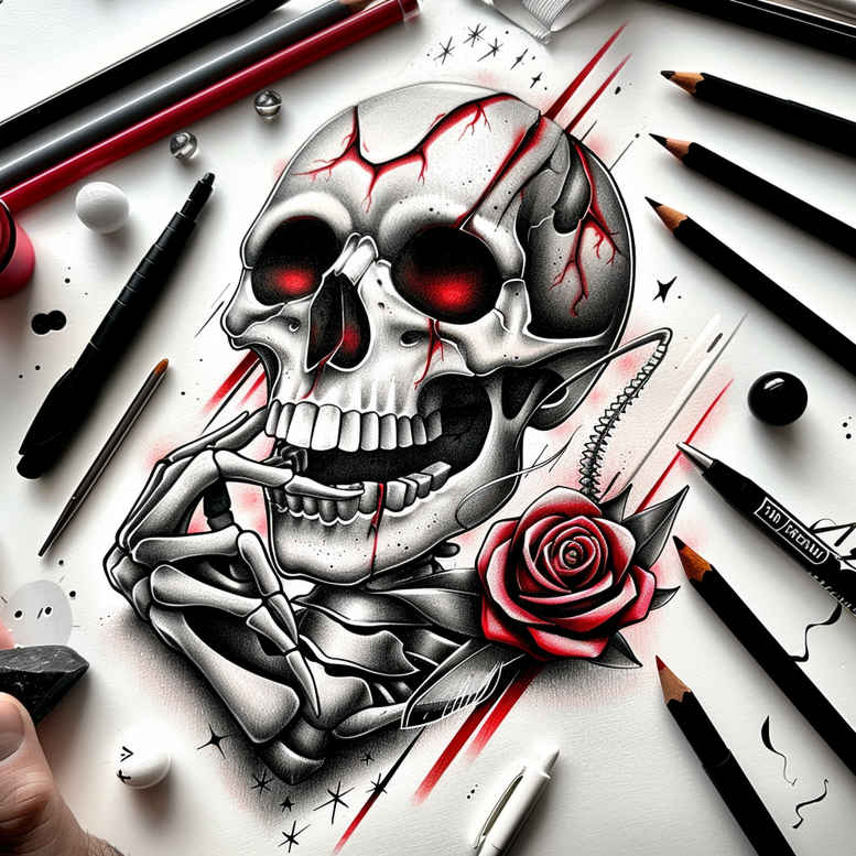 AI-generated tattoo project featuring a dark skull entwined with a rose, rendered in black and grey with meticulous shading to achieve a luminous grayscale tonal range. The composition presents a central skull with hollow eye sockets and a hint of a grin, its cranium framed by a single vibrant rose that symbolizes life and enduring beauty amid darkness. Surrounding elements resemble blades and drafting instruments, arranged to create a kinetic boundary that guides the viewer’s eye toward the floral focal point and reinforces a sharp, mechanical edge. The design relies on realistic shading and fine line work, with subtle stippling in the bone texture and petal veining to convey depth without sacrificing clarity at smaller sizes. The result is a versatile tattoo design that translates well as a small piece or as the anchor of a larger sleeve, with room to adjust the line weight, contrast, and scale to fit a client’s anatomy. The black and grey palette ensures cohesion with existing tattoos and age-appropriate fading, while sparing red accents can be added to the rose or eyes for a dramatic focal point. For potential clients seeking meaningful tattoos, this concept balances mortality and beauty through symbolic imagery: skull as reminder of impermanence, rose as resilience, and blades as precise, edgy energy. The AI-generated origin underscores that this is a tattoo project concept ready for customization, not a final stencil. It’s particularly suitable for cover-up scenarios, where the bold grayscale shading and strong contrast can effectively mask older ink while yielding a fresh, timeless look. Keywords woven through include tattoo, tattoo design, meaningful tattoos, fine line tattoo, rose tattoo design, black and grey, realistic tattoo, custom tattoo design, Japanese style tattoo, flower tattoos, and ink-friendly body art.