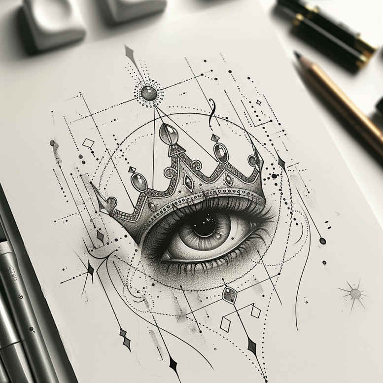 This AI-generated tattoo project depicts an eye centered beneath a regal crown, framed by precise geometric lines and a circlet of circles. Rendered in black and grey, the piece embraces fine line technique, with delicate shading that builds depth while preserving a clean, crisp edit suitable for many placements. The eye acts as a focal point—a window to perception and vigilance—while the crown above signifies authority, protection, and personal sovereignty. The surrounding geometry functions as a mandala-like pattern scaffold, suggesting balance, fate, and continuity; it also offers an ideal background for a cover-up, as the dark lines can neatly overlay existing ink. The pencil sketch feel and measured line-work imply a tattoo design concept rather than a finished piece, inviting a client to adapt scale and motifs. Its black-and-grey palette ensures timeless versatility and compatibility with other elements, including floral motifs, infinity lines, or Japanese-style accents, should the client wish to expand into a larger composition. For studios focusing on meaningful tattoos, this concept blends symbolism with a modern graphic language, suitable for small or medium-sized placements. In terms of technique, the design leans into fine line precision, subtle dot-work shading, and controlled contrast to maintain legibility over time while preserving a delicate aesthetic. The intended meaning can be interpreted as awakening and protection, a personal talisman that accompanies the wearer daily. As an AI-generated tattoo project, it models a clean, adaptable foundation that tattoo artists can customize: adjust crown detail, refine the geometry, or integrate additional symbols like lotus petals or floral accents into a cohesive, custom tattoo design. The result is a versatile, durable blueprint that translates well into black and grey realism or stylized tribal-inflected forms, reinforcing the appeal of contemporary body art and ink. While the concept remains highly adaptable, its core message of vision, sovereignty, and continuity keeps it relevant across age groups and tattoo cultures.