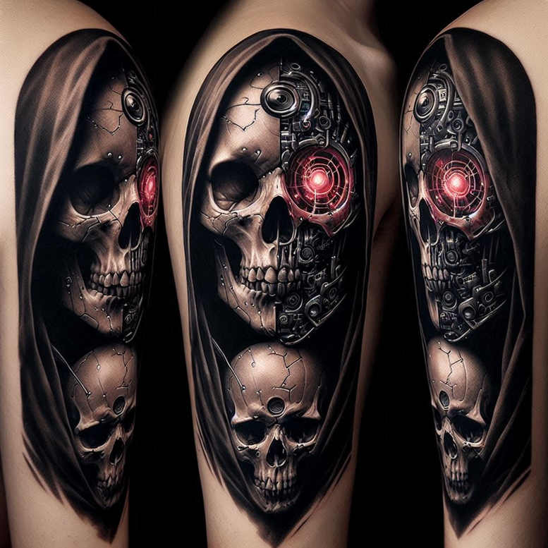 This AI-generated tattoo project presents a highly detailed black-and-grey sleeve composition that fuses gothic skull imagery with precision mechanical architecture. The central motif is a skull, rendered with bone texture, subtle stippling, and deep shadow, framed by a hooded cloak that sweeps along the arm to create a dramatic corridor for the scene. Interwoven gearwork, pistons, rivets, and circuitry occupy the dorsal and lateral zones, forming a cybernetic silhouette that reads as a futuristic relic while preserving a classic tattoo sensibility. A red lens-like orb punctuates the right side of the skull, offering a sharp color contrast against the monochrome palette and serving as a visual anchor that guides the gaze from forearm to shoulder. The work relies on smooth gradient transitions, razor-thin linework for fine details, and intentional negative space to preserve contrast on darker skin tones, ensuring legibility as a long-term piece. While dense with form, the composition remains cohesive, allowing a tattoo artist to render the elements as a seamless wrap, or to modulate density for a cover-up scenario where older ink must be obscured. The pattern of cracked circuitry and segmented gearplates reinforces a theme of resilience and transformation, echoing ideas of mortality and technology in a single, meaningful tattoo design. This piece aligns with trends in realistic black-and-grey tattoos and pattern-laden sleeve concepts, offering a bold statement for clients seeking a cover-up or a standout body art conversation starter. AI-generated tattoo project notes: a proof of concept in digital-to-skin translation, inviting adaptation by skilled artists to fit individual anatomy and skin tone. In sum, this tattoo design blends anatomy, machinery, and symbolism into a powerful sleeve that reads as both homage to classic skull art and a nod to cybernetic futurism, ideal for those seeking a large-scale, meaningful tattoo. It is well-suited for a cover-up due to its dense negative space interplay and ability to obscure existing markings beneath mechanical detail, and its pattern-heavy composition ensures visual impact from every angle.