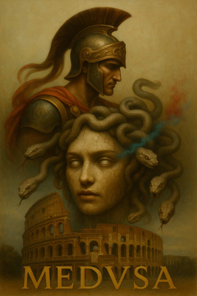 AI-generated tattoo project blending myth and antiquity into a single dramatic composition, ideal for a bold cover-up or large-scale body art piece. The focal Medusa head sits center stage, its face rendered in a cracked stone texture that suggests ancient sculpture weathered by time. From the crown, serpents emerge in sinuous coils, their scales and glints of light rendered with careful shading to convey lifelike motion as they wrap around Medusa’s visage. Behind them rises a helmeted warrior, a nod to classical myth and heroic memory, with a bronze helm and a red cape suggested through tonal hints rather than bright color. At the base, the Colosseum curves into view, anchoring the scene in Roman history and giving the piece a strong architectural counterweight to the organic forms above. The overall palette stays in black and grey, with warm sepia undertones to evoke vintage sculpture, a choice that enhances readability on skin and translates well into tattoo design. The crackled texture on Medusa’s face doubles as a subtle pattern that adds depth and continuity across the composition, while the serpents provide rhythmic movement that guides the eye through the piece. Symbolically, Medusa embodies transformation and guarded power; the serpents symbolize danger and protection; the Colosseum signifies endurance and memory of empire. The design leans toward realism in shading, balancing soft gradients with sharp line work for a cohesive black and grey tattoo. It’s a custom tattoo design crafted for size versatility—strong enough for large canvases, refined for smaller executions—and it mirrors modern tattoo trends in meaningful tattoos and body art that rely on subtle texture and dynamic composition. Although AI created, the concept respects traditional tattoo aesthetics, delivering a wearable art piece that blends historical iconography with contemporary technique, and it remains suitable as a cover-up due to its dense surrounding imagery and the ability to rework existing ink beneath into a fresh, cohesive narrative.