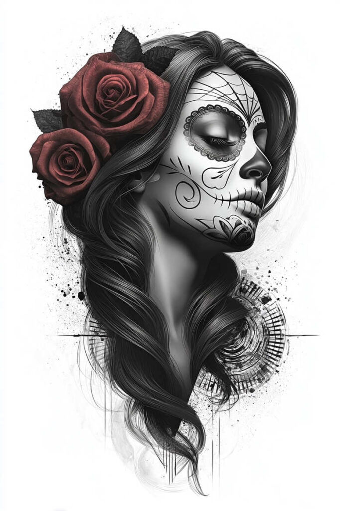 AI-generated tattoo project presenting a refined sugar skull portrait rendered in black and grey with two crimson roses nestled in the model’s flowing hair. The composition centers on a serene profile where ornate sugar skull motifs contour the forehead, cheeks, and chin, while delicate curls cascade along the neck. Graphic patterns—swirls, lace-like beads, and geometric flourishes—mark the surface of the face, giving a modern edge to traditional Dia de los Muertos symbolism. The shading is meticulously layered, combining smooth gradients on the skin with crisp line work on the skull elements, a hallmark of fine line tattoo practice. The roses push a bold color cue, offering a striking counterpoint to the monochrome palette and providing versatile options for color realism or tight black and grey execution. The piece demonstrates a careful balance between realistic tattoo shading and graphic ornamentation, making it suitable as a standalone tattoo design or as a robust template for a larger body of work on the shoulder, arm, or chest. In terms of meaning, the roses symbolize love and remembrance, while the skull motif encapsulates mortality, memory, and resilience; together they invite personal interpretation, making this a meaningful tattoo concept for collectors seeking symbolism in their ink. Technically, the image leans into the aesthetics of black and grey tattoos, with a focus on clean, continuous lines, soft transitions, and controlled splatter that translate well onto skin. The design nods to a Japanese style tattoo sensibility through restraint and precision, while remaining accessible as a small tattoos piece or flower tattoos motif; it could be expanded into a lotus flower tattoo motif or integrated with infinity or tribal elements if desired. This AI-generated tattoo project serves as a versatile reference for a custom tattoo design, where the balance of patterning, realistic shading, and graphic line work can be tailored to individual skin tone and canvas.